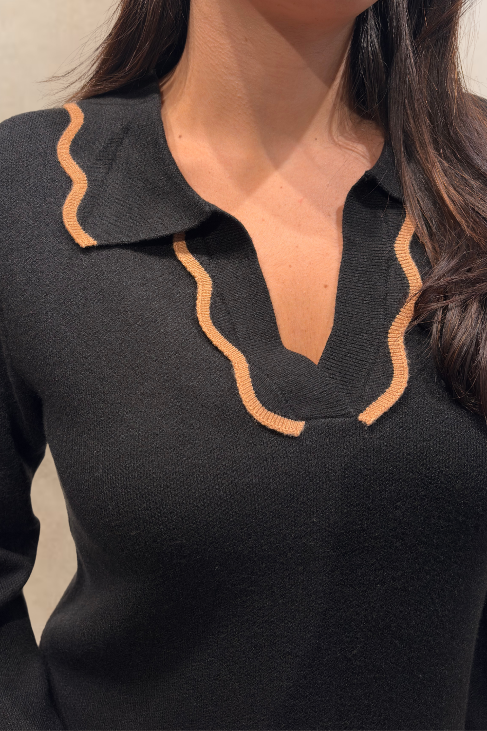 The Alice knit dress brings effortless sophistication with a touch of elegant charm. Designed in timeless black, this knit dress features a relaxed silhouette complemented by a classic shirt collar with brown details at the neckline, adding just the right amount of artisanal flair. Crafted for comfort and style, the Alice dress can be dressed up with boots or kept casual with flats—your new go-to for laid-back chic.