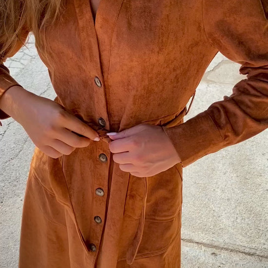 Anastasia dress blends casual charm with refined elegance. Crafted in a rich brown tone, its soft velvet texture adds a luxurious feel while maintaining an effortlessly relaxed silhouette. The button front and adjustable waist belt create a flattering, feminine shape that works beautifully for both casual outings and more elevated occasions.
