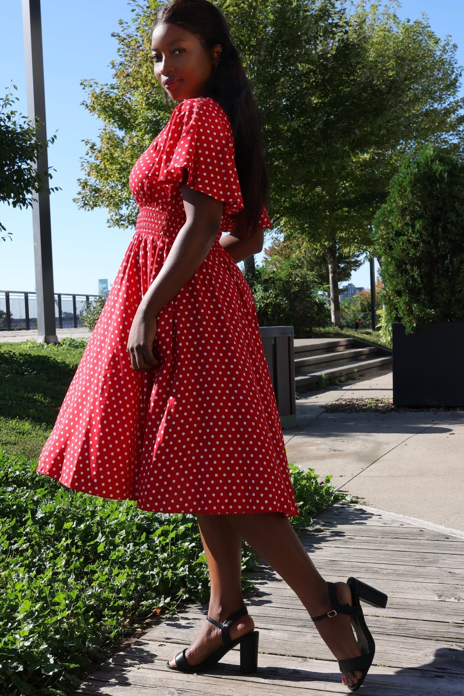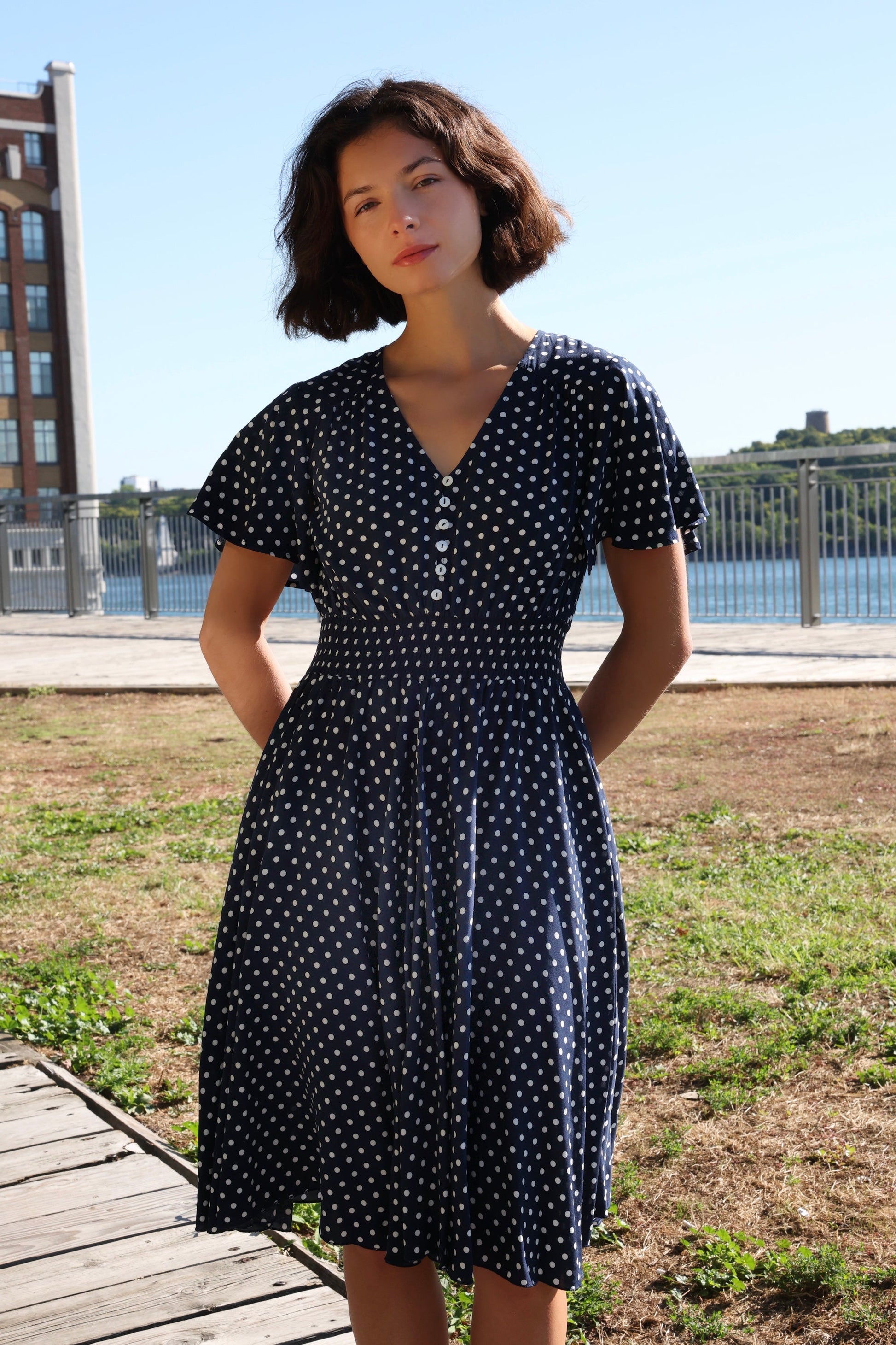 The Antoinette Dot Short Dress brings together romantic detail and everyday ease. Featuring flutter sleeves, a smocked waist, and a button-down front, this flattering silhouette flows effortlessly from day to night. Designed for movement and comfort, it's the kind of dress you'll reach for all season long. Yes, it has pockets! Ideal for warm-weather outings, brunches, or casual getaways.