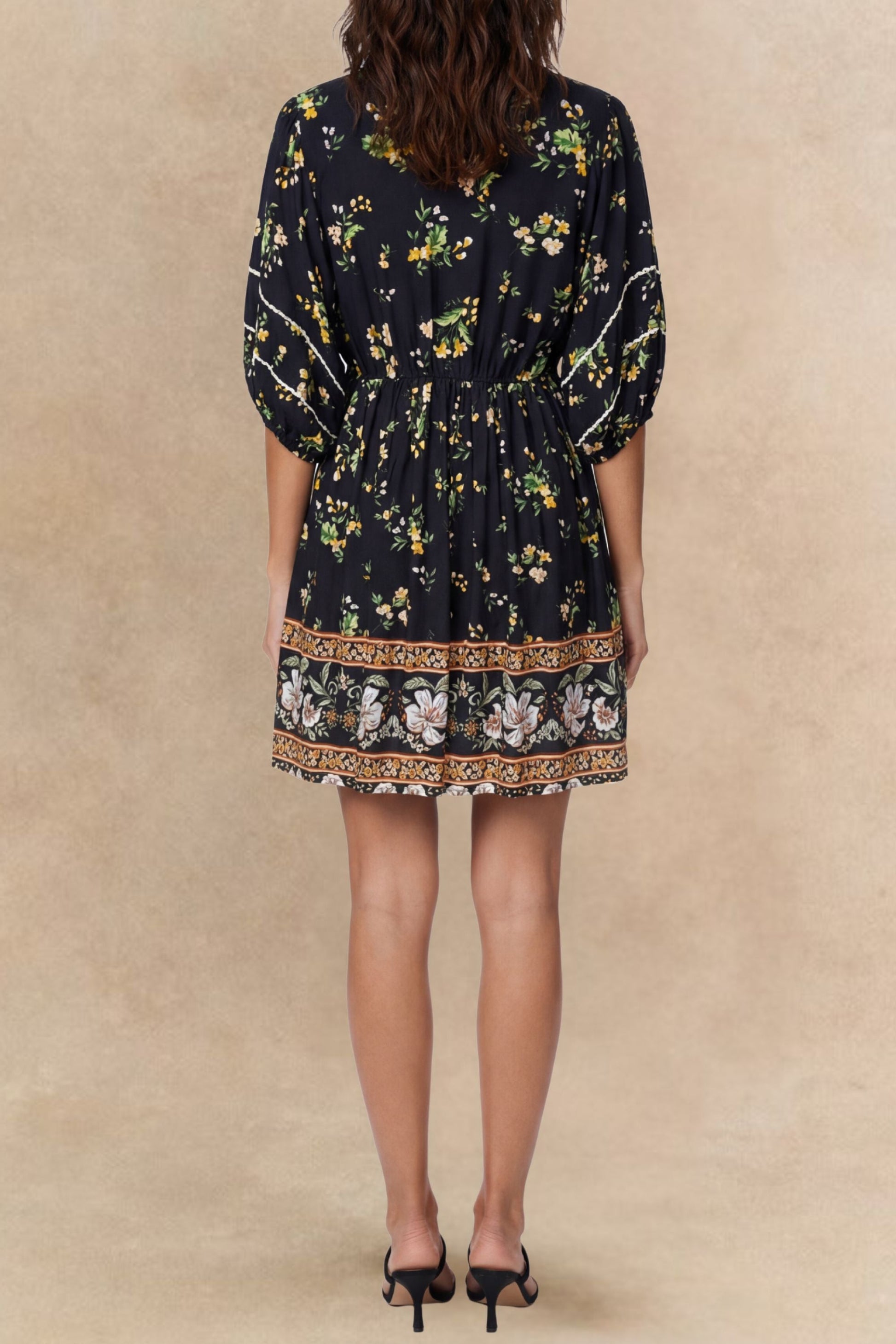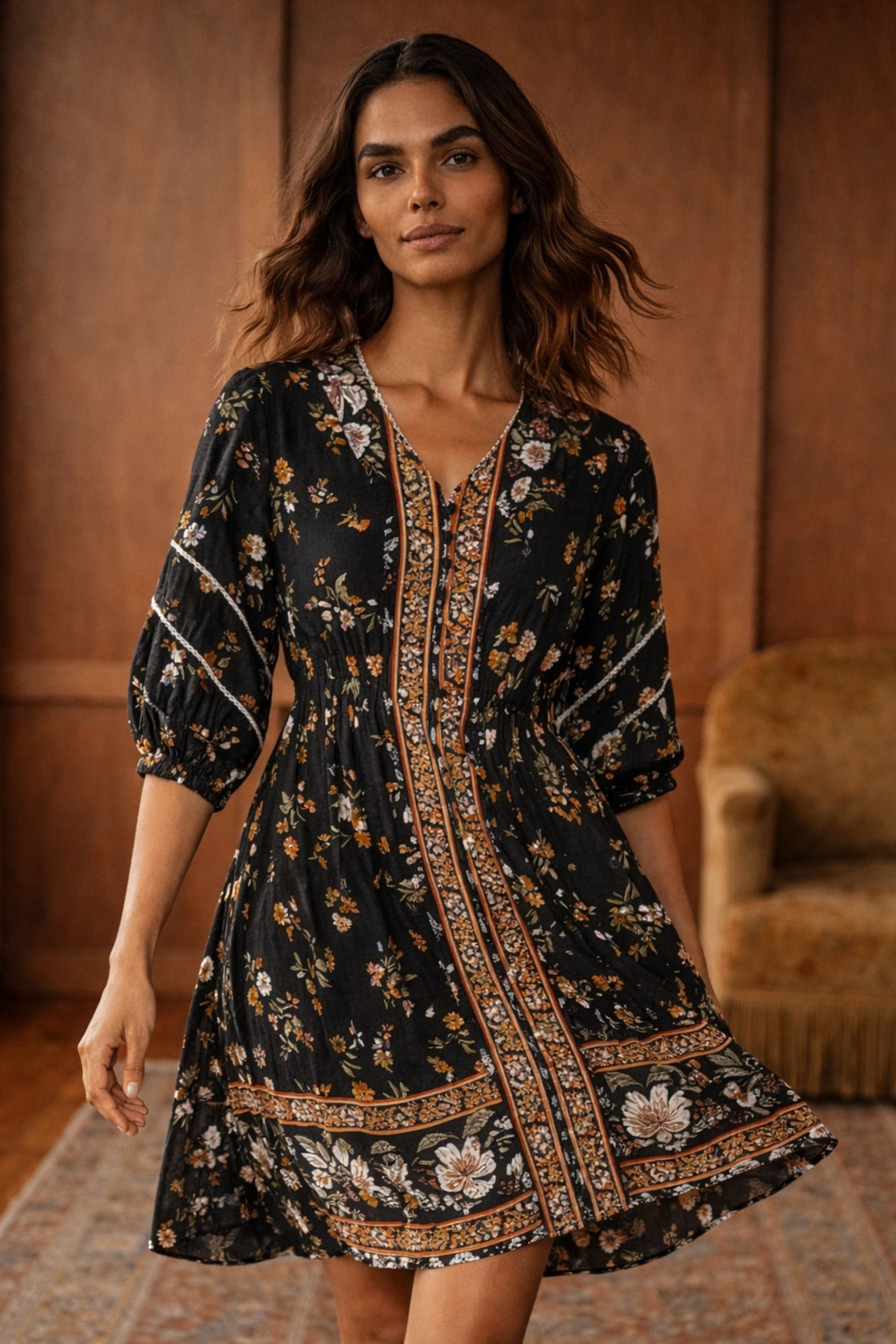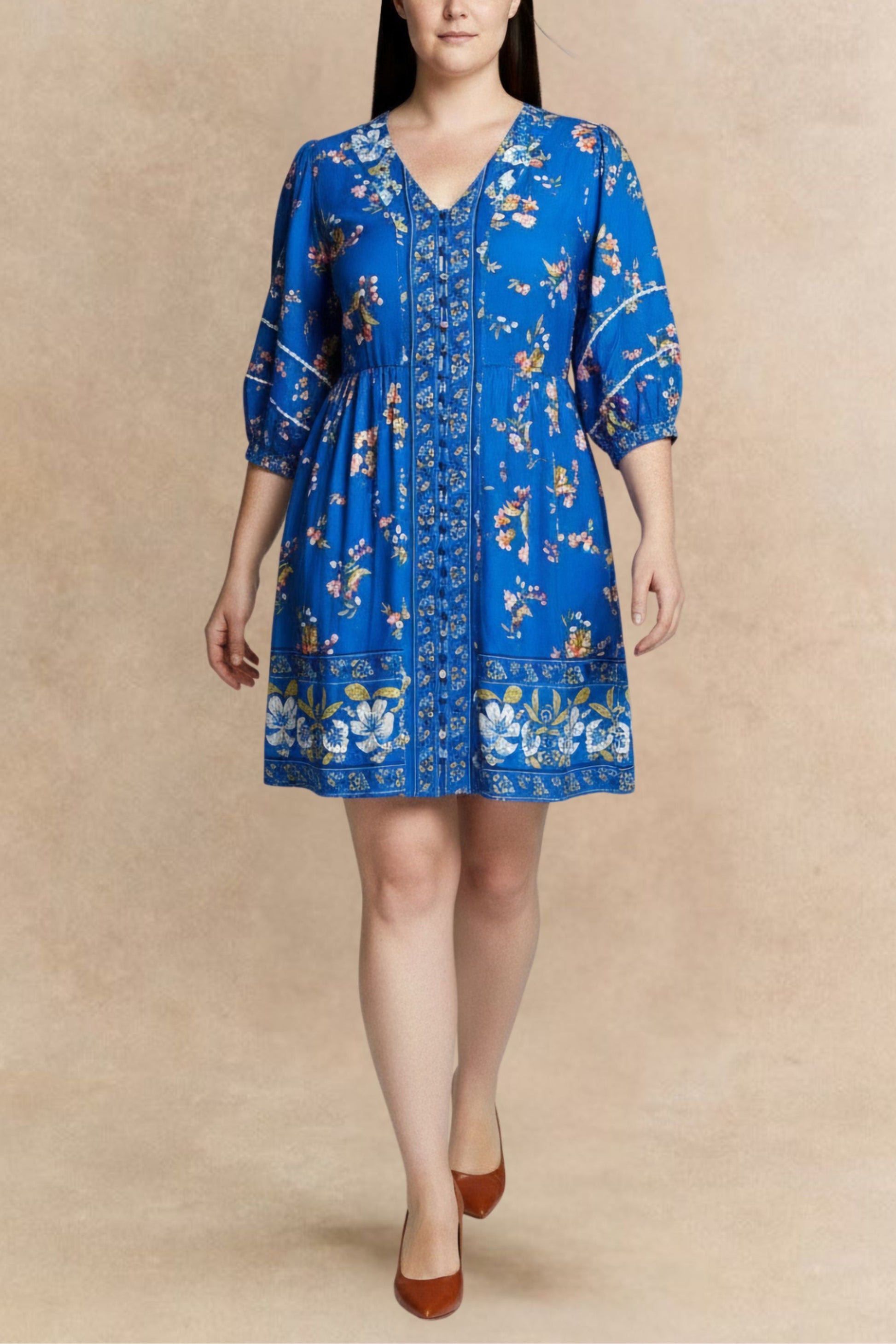 The Birgitta dress is an effortlessly charming piece with a breezy, flared silhouette that’s as flattering as it is comfortable. Falling just above the knee, this short dress is perfect for sunny days, weekend outings, or easy layering. It features a bohemian floral print on a rich teal background, framed by vertical border panels that elongate the figure. Puffed mid-length sleeves, give the piece a romantic, vintage-inspired feel. Decorative front buttons add artisan charm, and hidden side pockets bring a practical, relaxed touch.