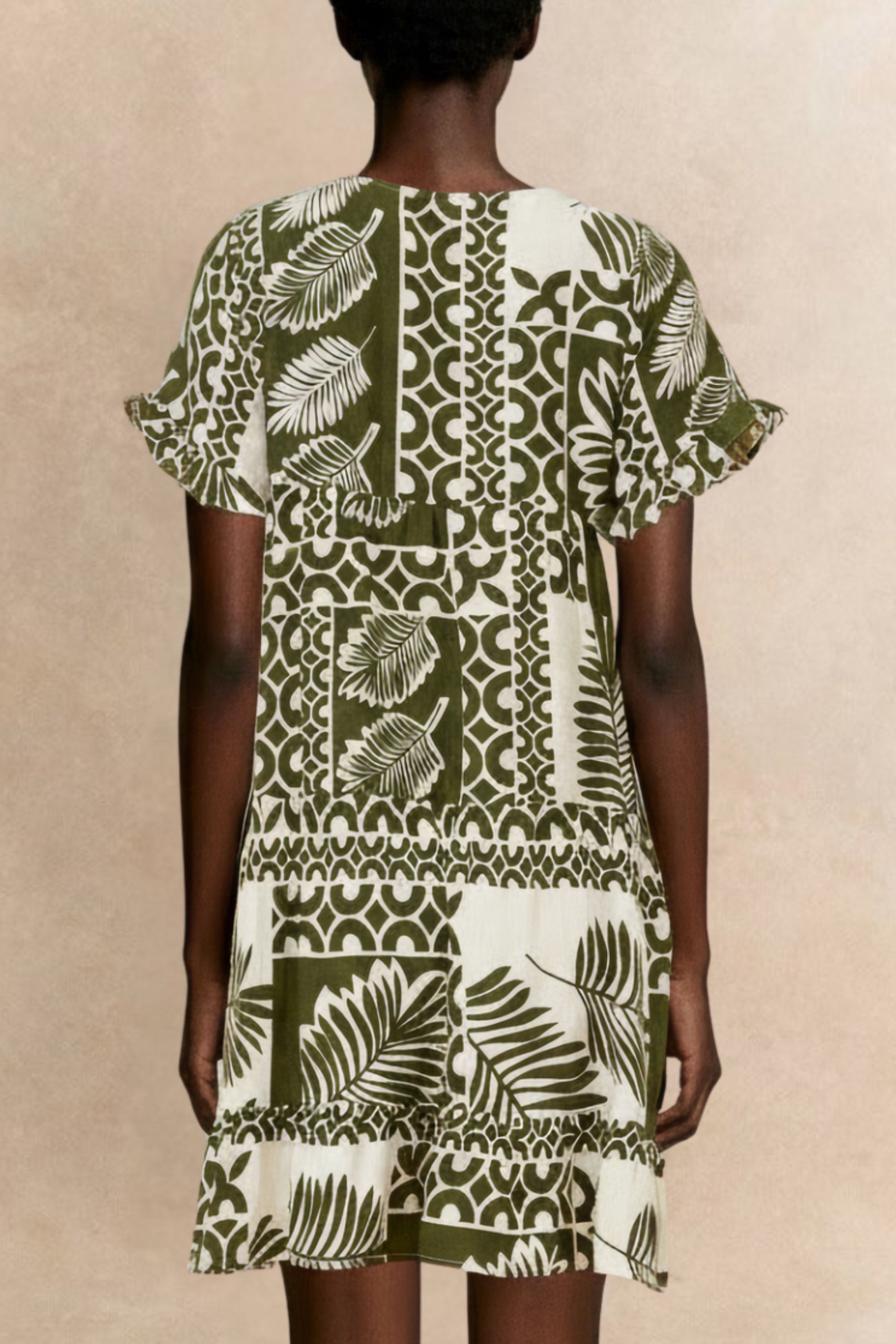 Effortlessly bold and breezy, the Clara dress brings a fresh twist to everyday dressing with its vibrant green patchwork and tropical leaf motifs. Crafted in a soft, flowy fabric, this relaxed-fit piece features playful ruffled sleeves and a flattering above-the-knee 36" length. Perfect for sunny days, casual getaways, or an easy-chic look around town, Clara pairs beautifully with sandals or sneakers for laid-back style with a standout print.