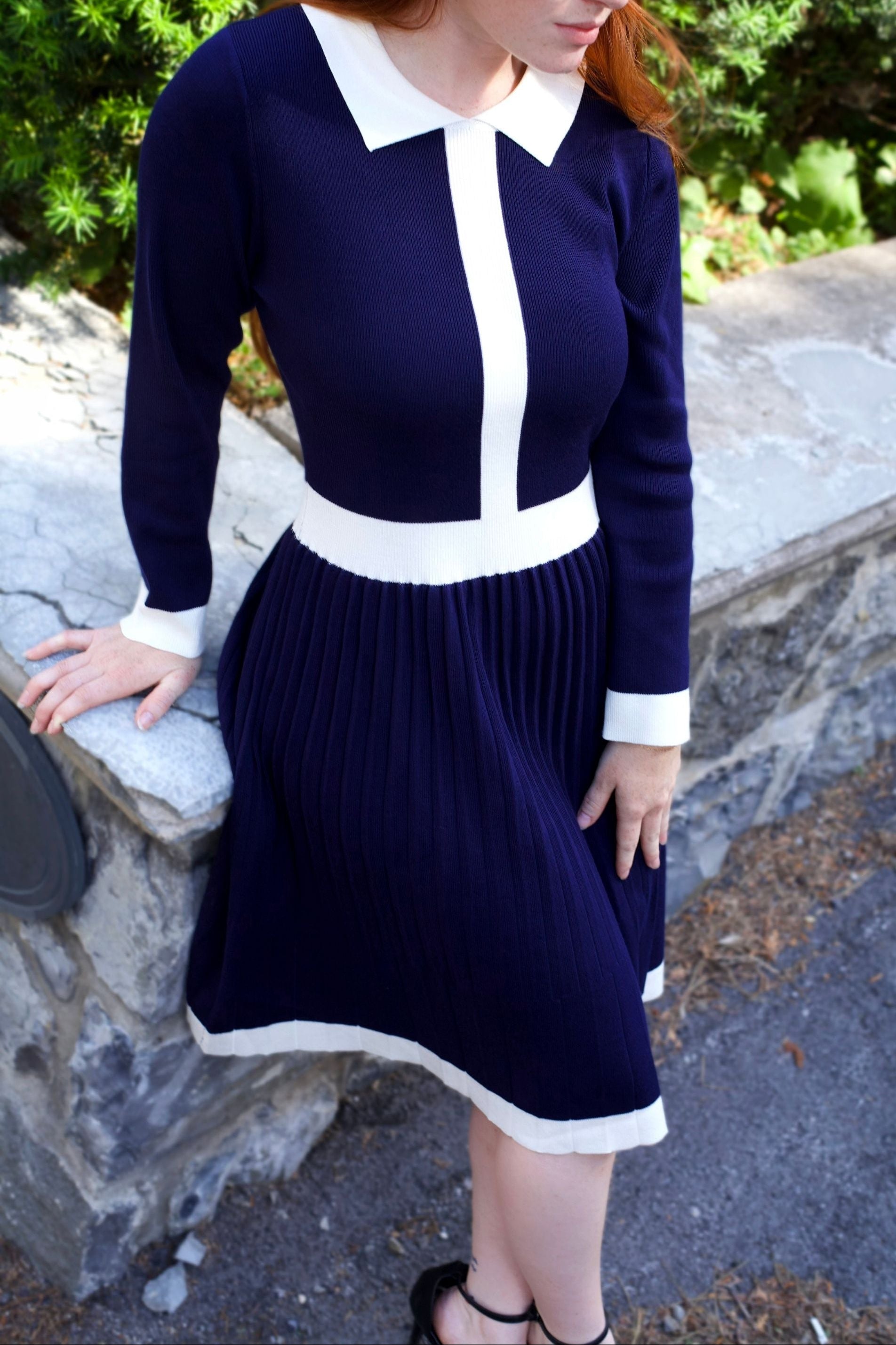 The Clarissa dress blends timeless elegance with subtle vintage flair in a flattering fit-and-flare silhouette. Designed with a soft, structured knit, this dress features bold contrast trim that highlights the waist, collar, and cuffs, creating a refined yet playful look. The pleated skirt adds graceful movement, while the long sleeves offer all-season versatility. Available in two striking colorways—classic black with warm rust and deep navy with crisp ivory—Clarissa is a polished choice for workdays, gatherings, or city strolls.
