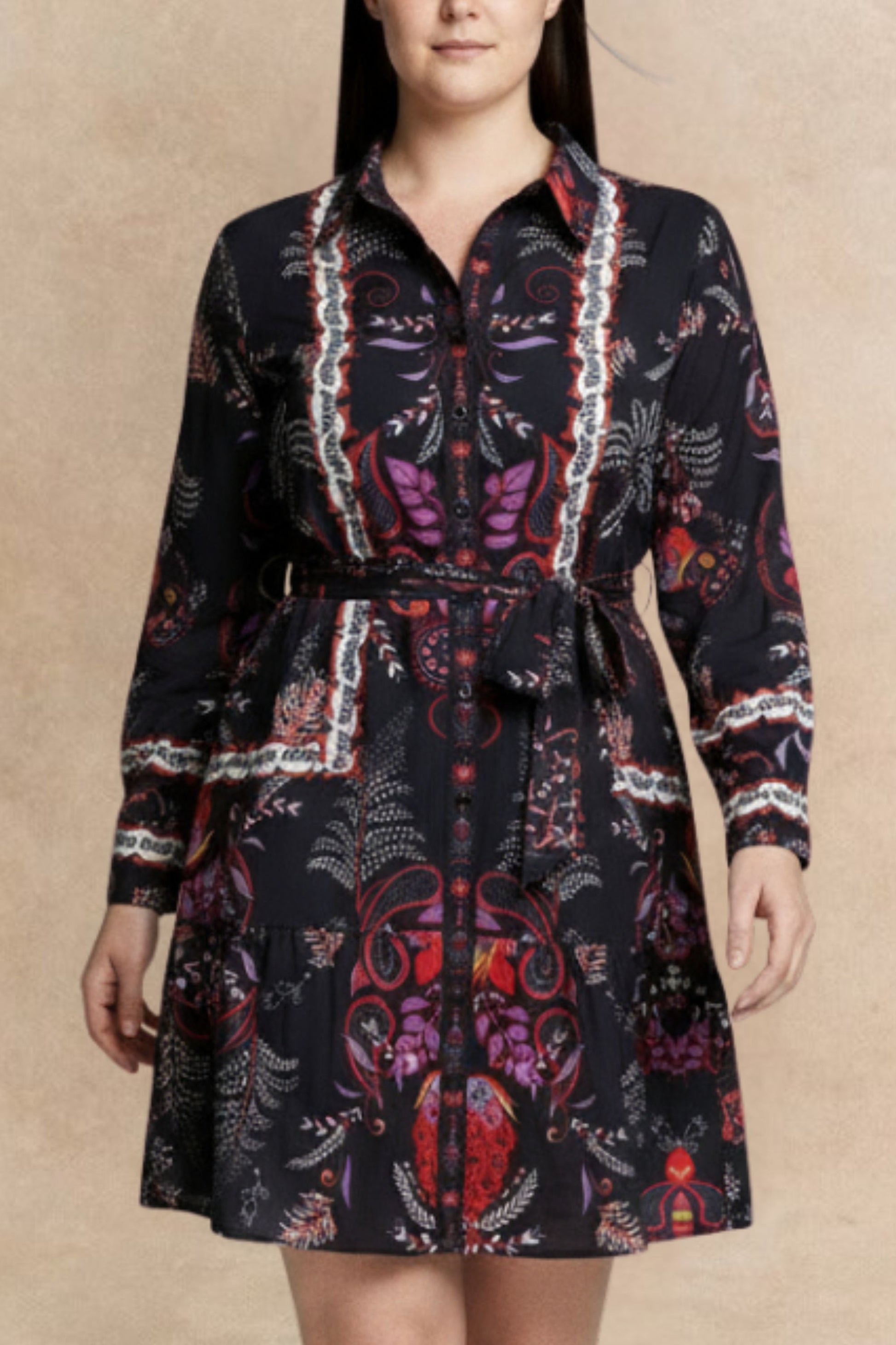 The Etna dress brings effortless elegance to everyday wear with its rich bohemian print and flattering shirt-dress silhouette. Designed for comfort and style, this piece features a tiered skirt, full button front, and a self-tie waist that cinches the figure beautifully. The long sleeves and collared neckline add a tailored touch, making it perfect for fall layering or transitional styling. Pair it with tall boots for a chic daytime look or dress it up with heels for evening outings.