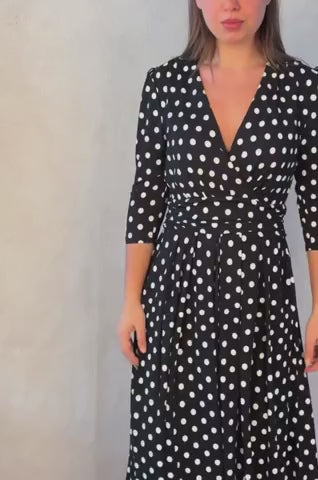 The Evelyn Midi Dress is a charming and playful piece, featuring a timeless black and white polka dot print. Designed with a flattering fit & flare silhouette, this dress highlights the waist beautifully while offering a comfortable and elegant fit. The crossover top with a V neckline adds a touch of sophistication, perfect for creating a refined yet effortless look.