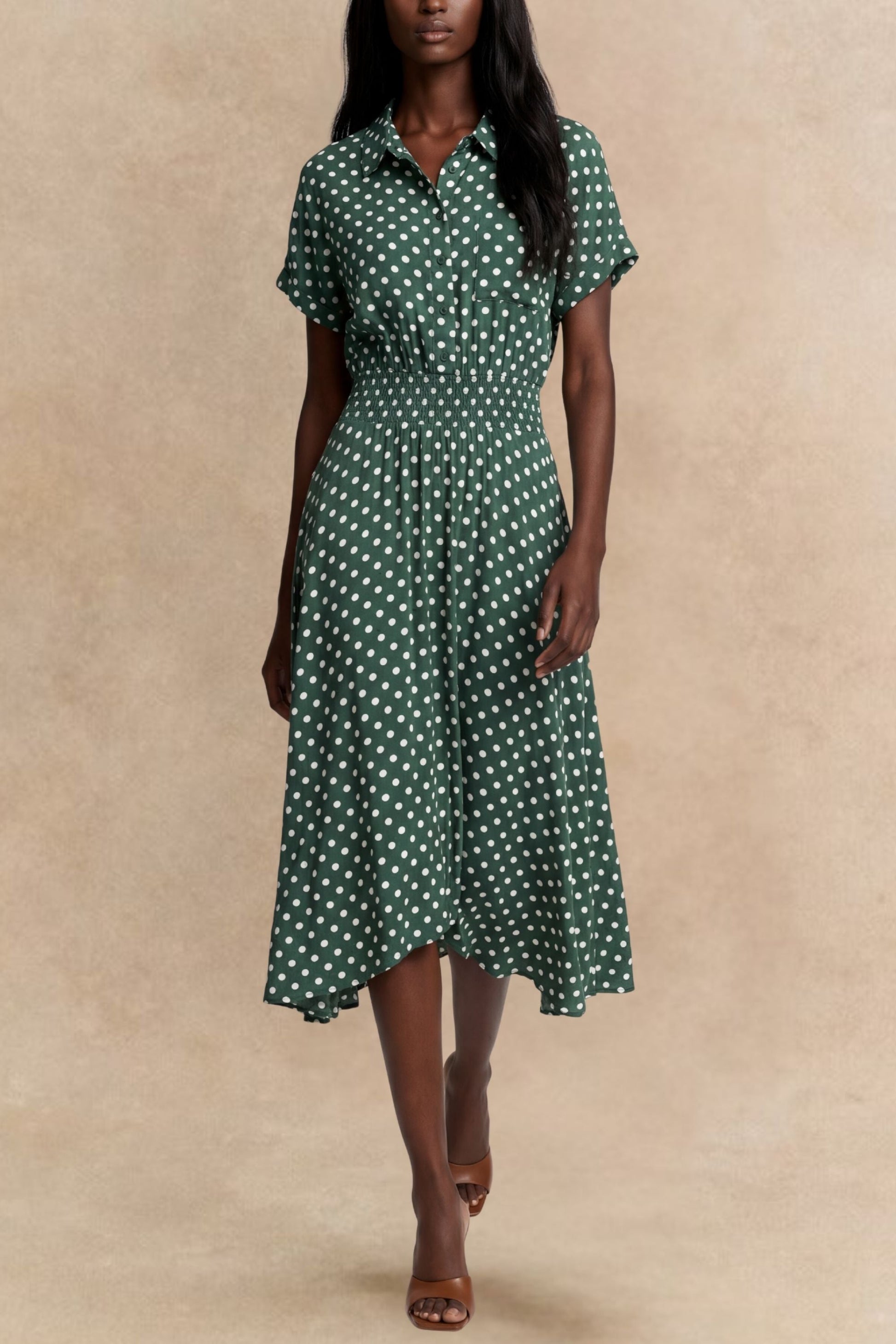 The Jacqueline midi dress features a refined shirt-style bodice with a flattering shirred waist that gently defines the silhouette. The flowing skirt creates effortless movement, while the button-front detail adds a timeless, polished touch. Designed for versatility, this easy-to-wear style transitions seamlessly from workdays to weekends and casual occasions.