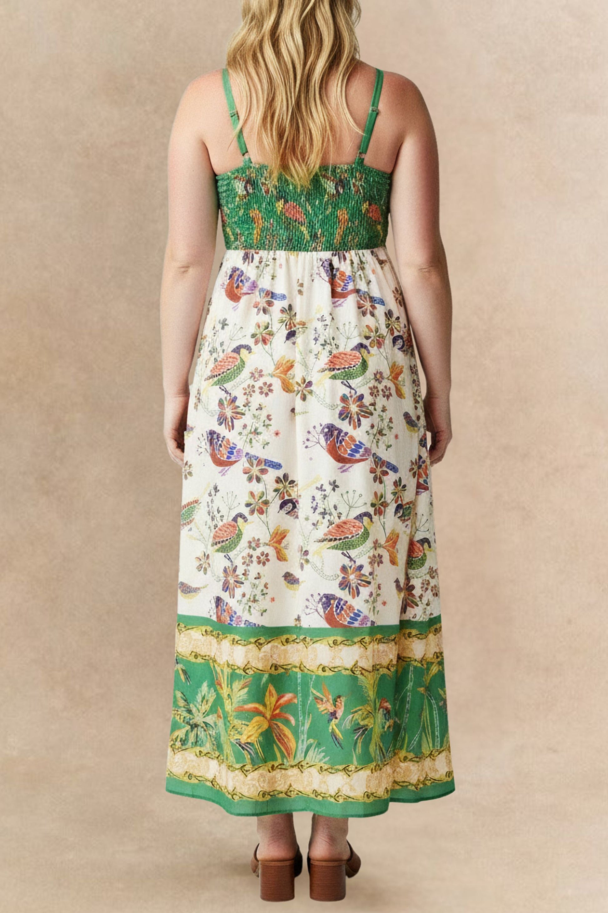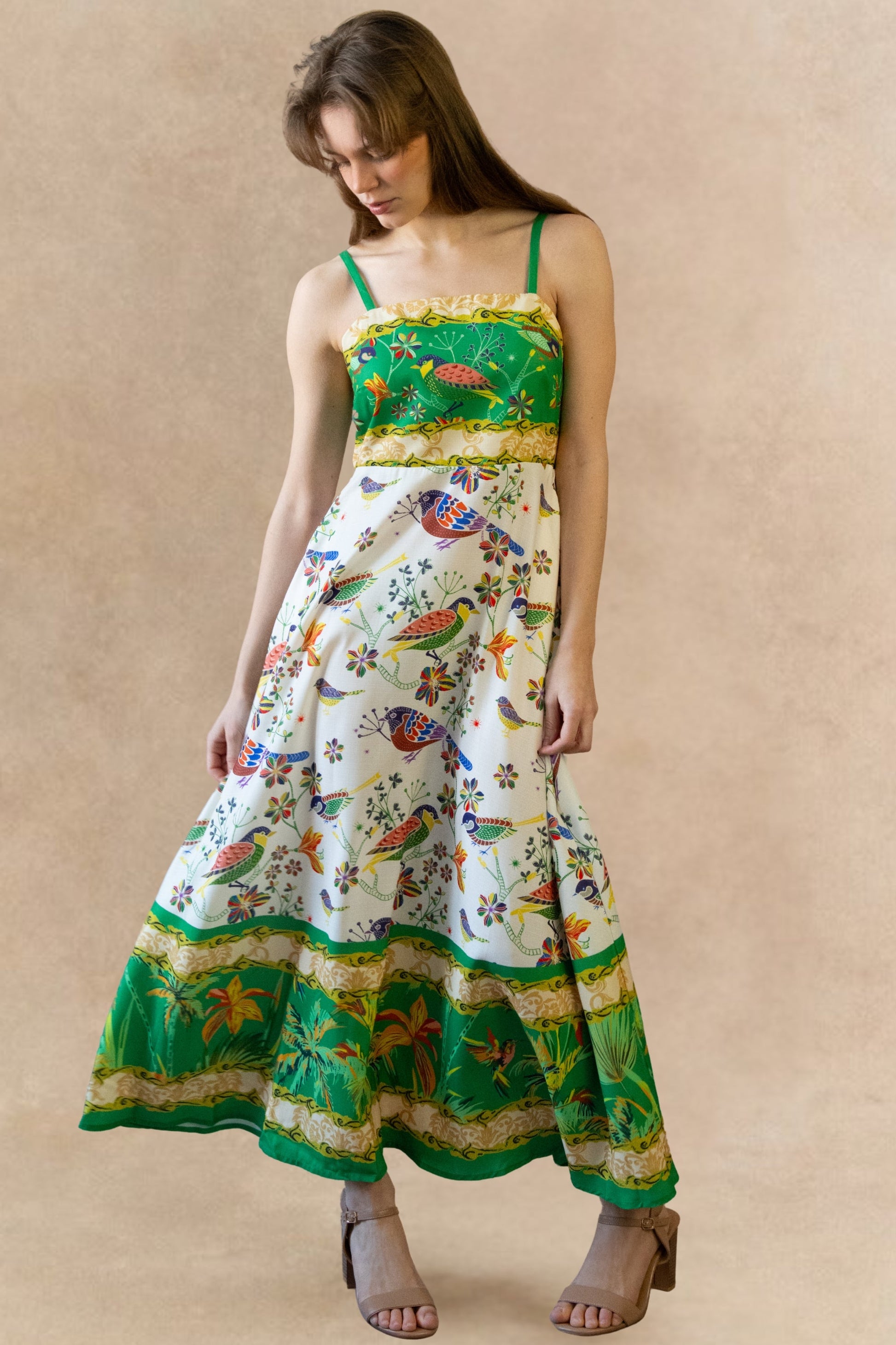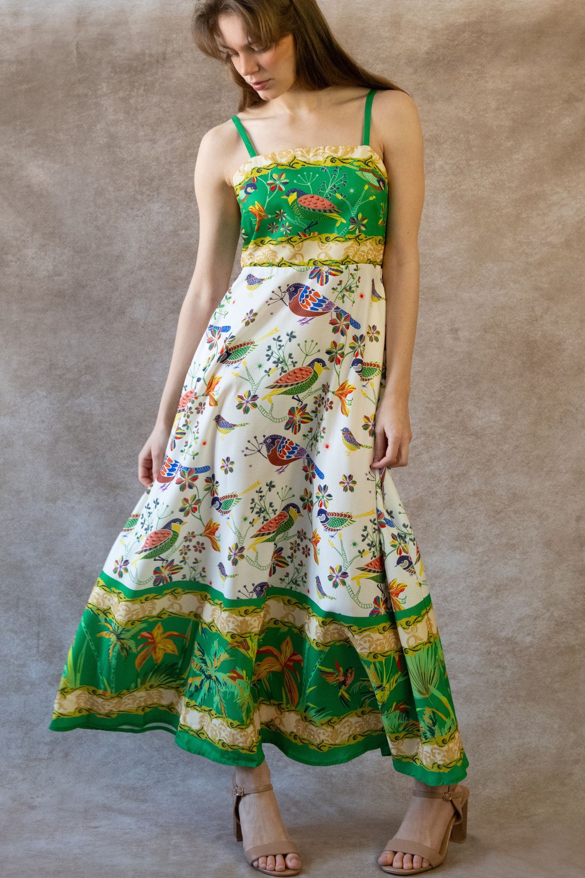 A flowing empire waist maxi dress featuring a vibrant bird and botanical print with a contrasting green bodice and adjustable straps. The fitted upper silhouette defines the waist, while the airy skirt moves effortlessly with every step. Finished with a decorative border hem, this statement dress transitions easily from daytime outings to warm-weather evenings.