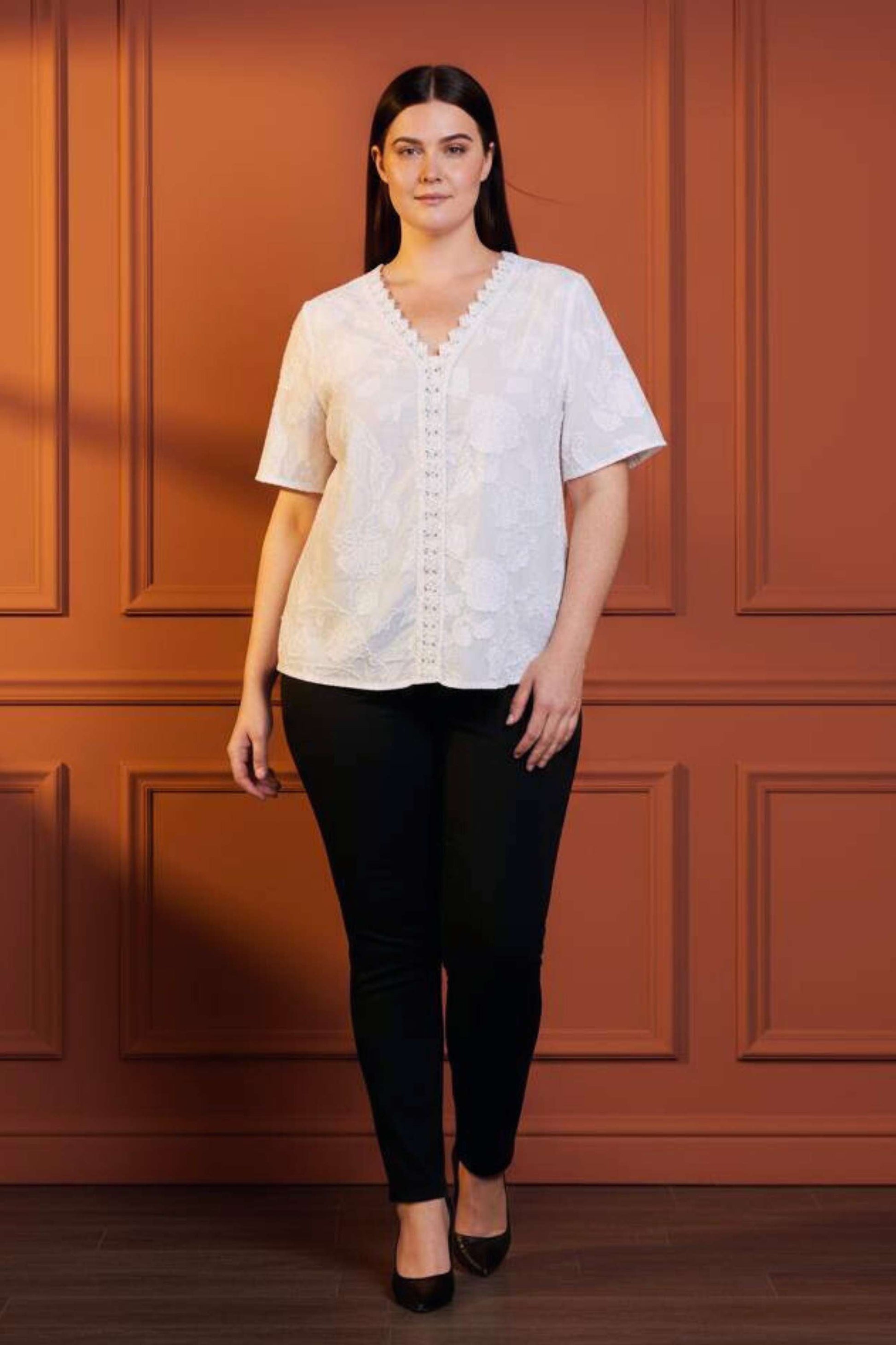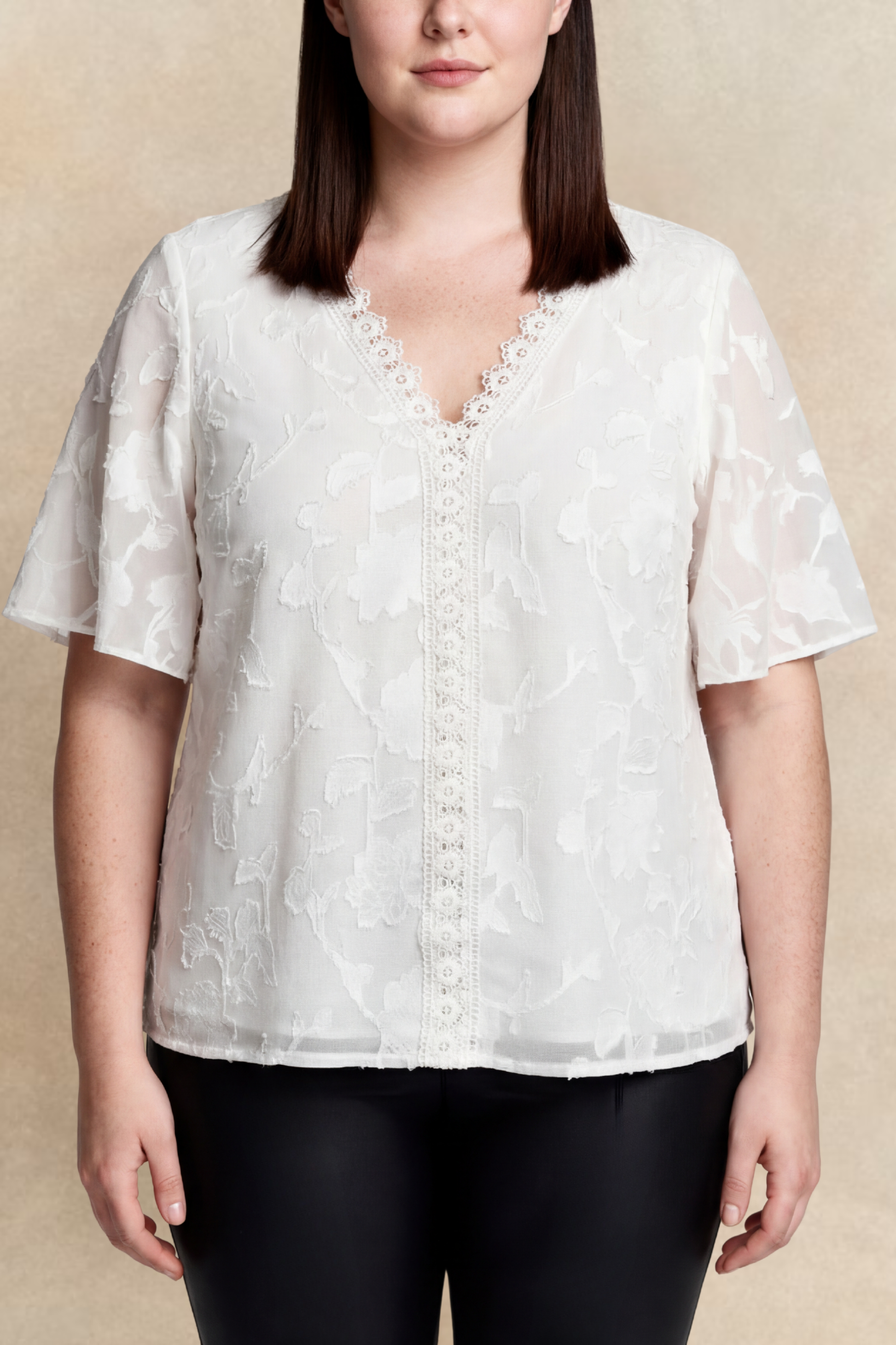 The Lucie blouse is a delicate blend of feminine charm and easy elegance. Crafted from 100% polyester, this lightweight top features tonal floral embroidery throughout, a scalloped V-neckline with lace trim, and soft flutter sleeves that move with grace. Perfect for pairing with denim or dressing up your favorite trousers, Lucie adds a romantic touch to any outfit, from casual lunches to garden parties.