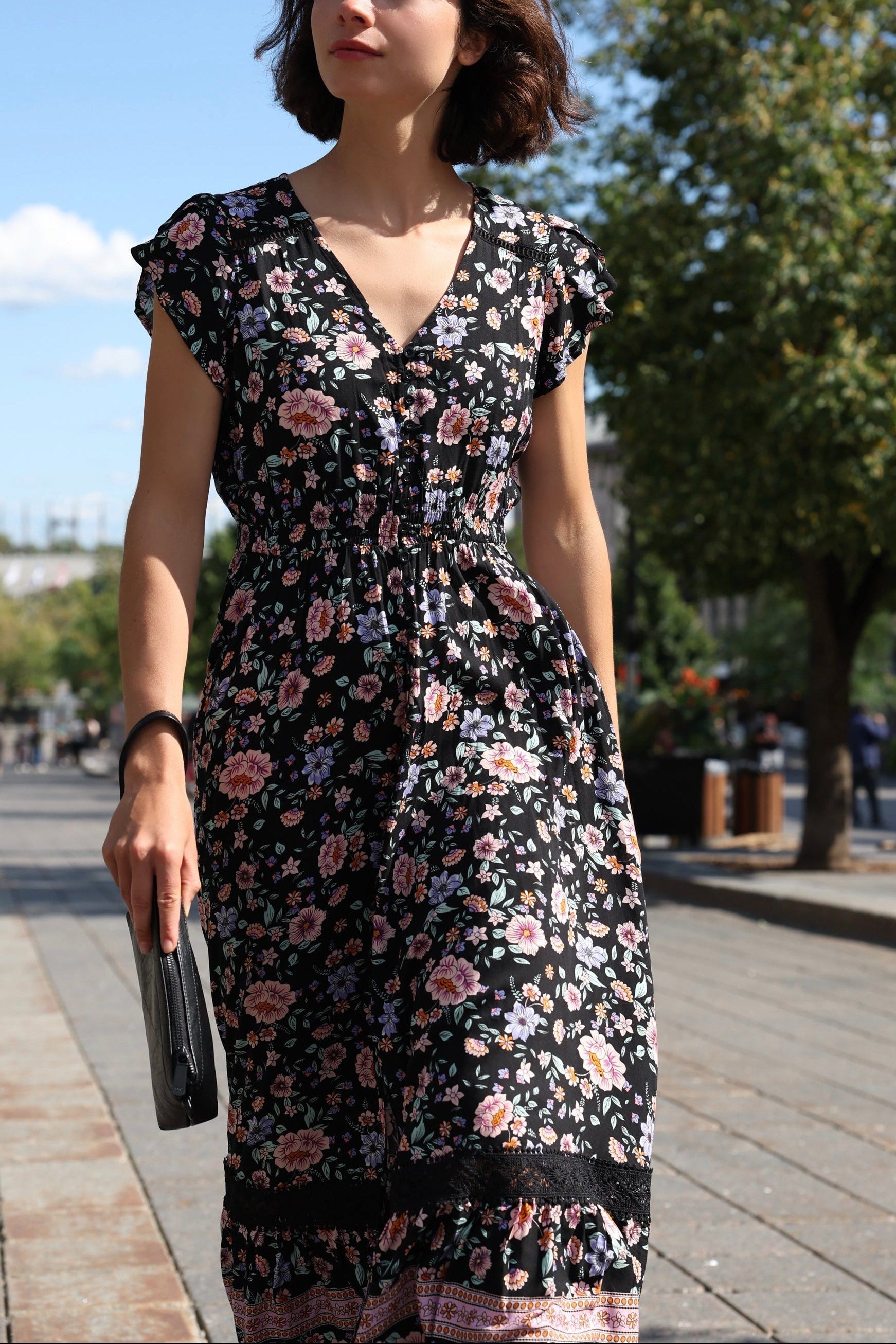 - Color: Black with multicolor floral print