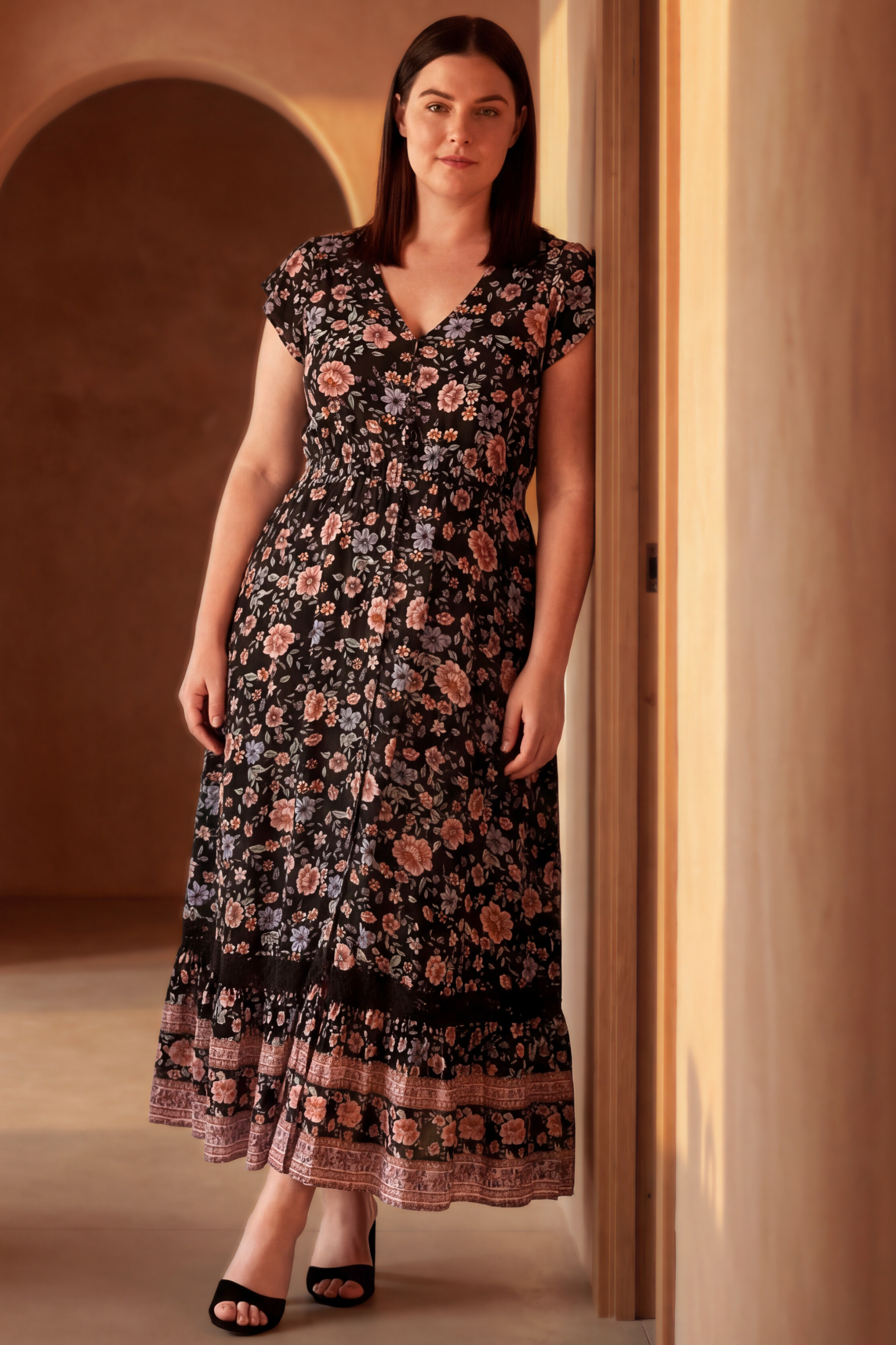The Michelle midi dress features a flattering V-neckline with soft cap sleeves that gently frame the shoulders. Designed with a subtly defined waist and a flowing skirt, it creates graceful movement and everyday ease. Finished with a decorative border hem, this feminine style transitions seamlessly from daytime wear to casual evenings.