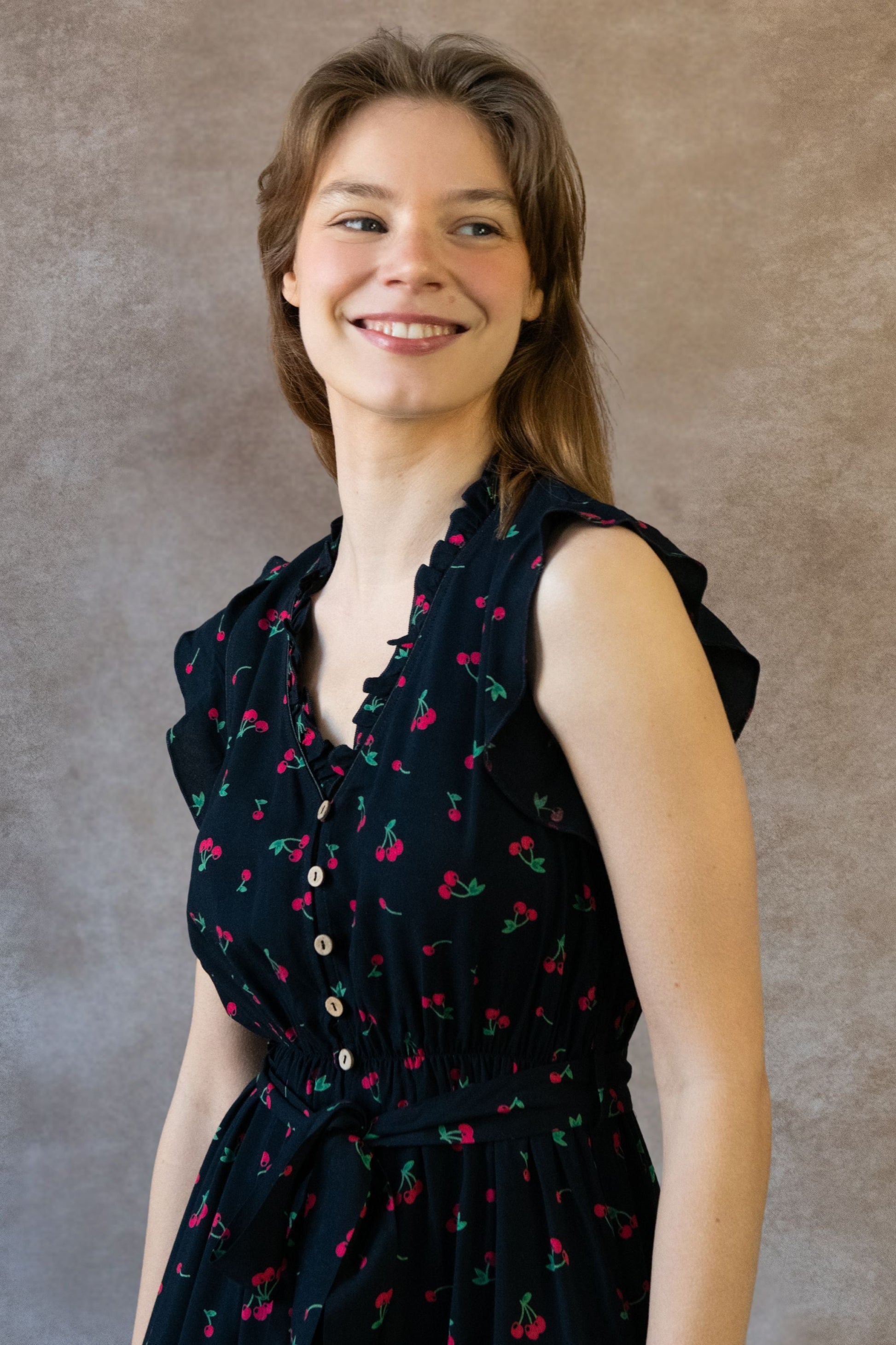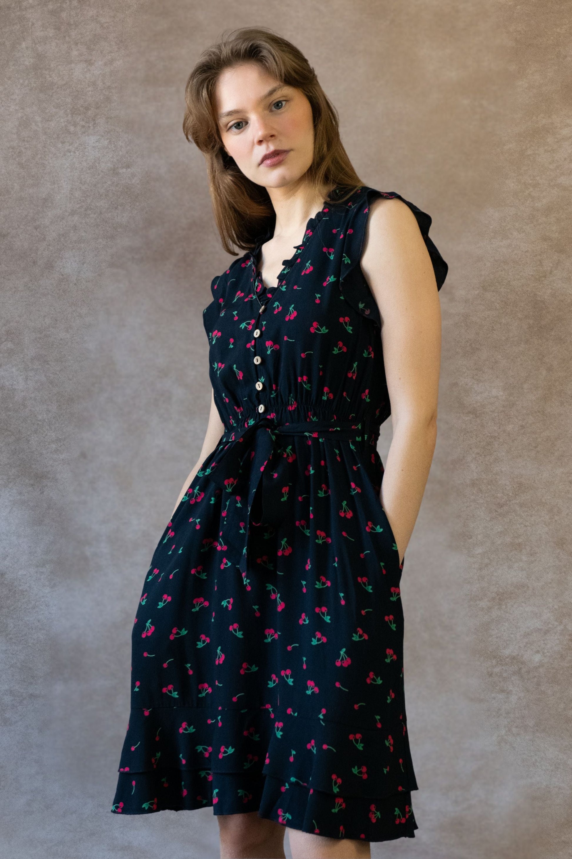 Sweet and effortlessly feminine, the Natasha cherry print dress brings a playful update to this best-selling silhouette. With flutter sleeves, a ruffle-trimmed neckline, and a removable self-tie belt at the elastic waist, it flatters every figure while keeping things light and breezy. Side pockets add function to its flirty charm. Made from breathable light weight fabric for a breathable, flowy feel