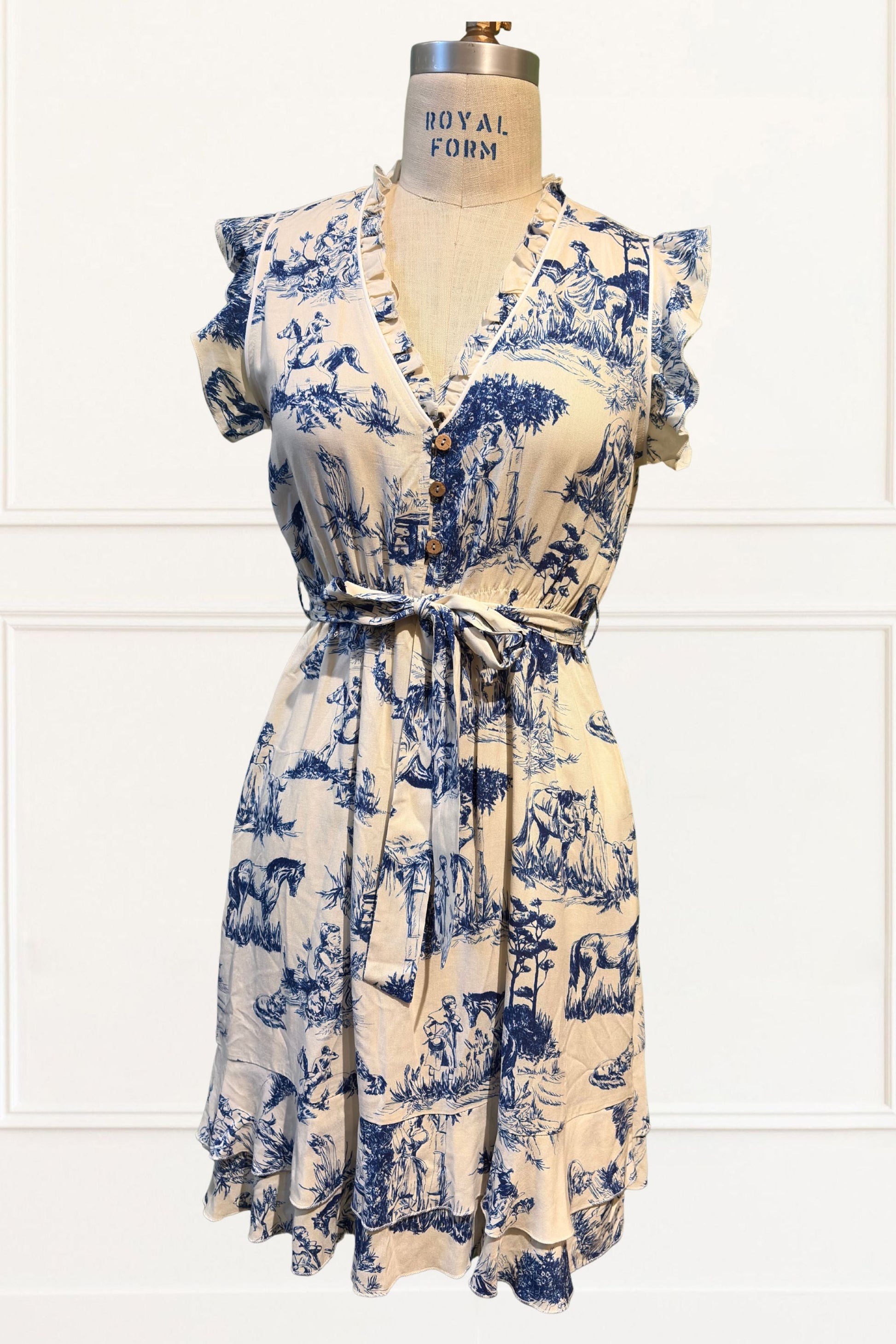Natasha Toile De Jouy Print Short Dress Self Belt Pockets Ruffle Trim