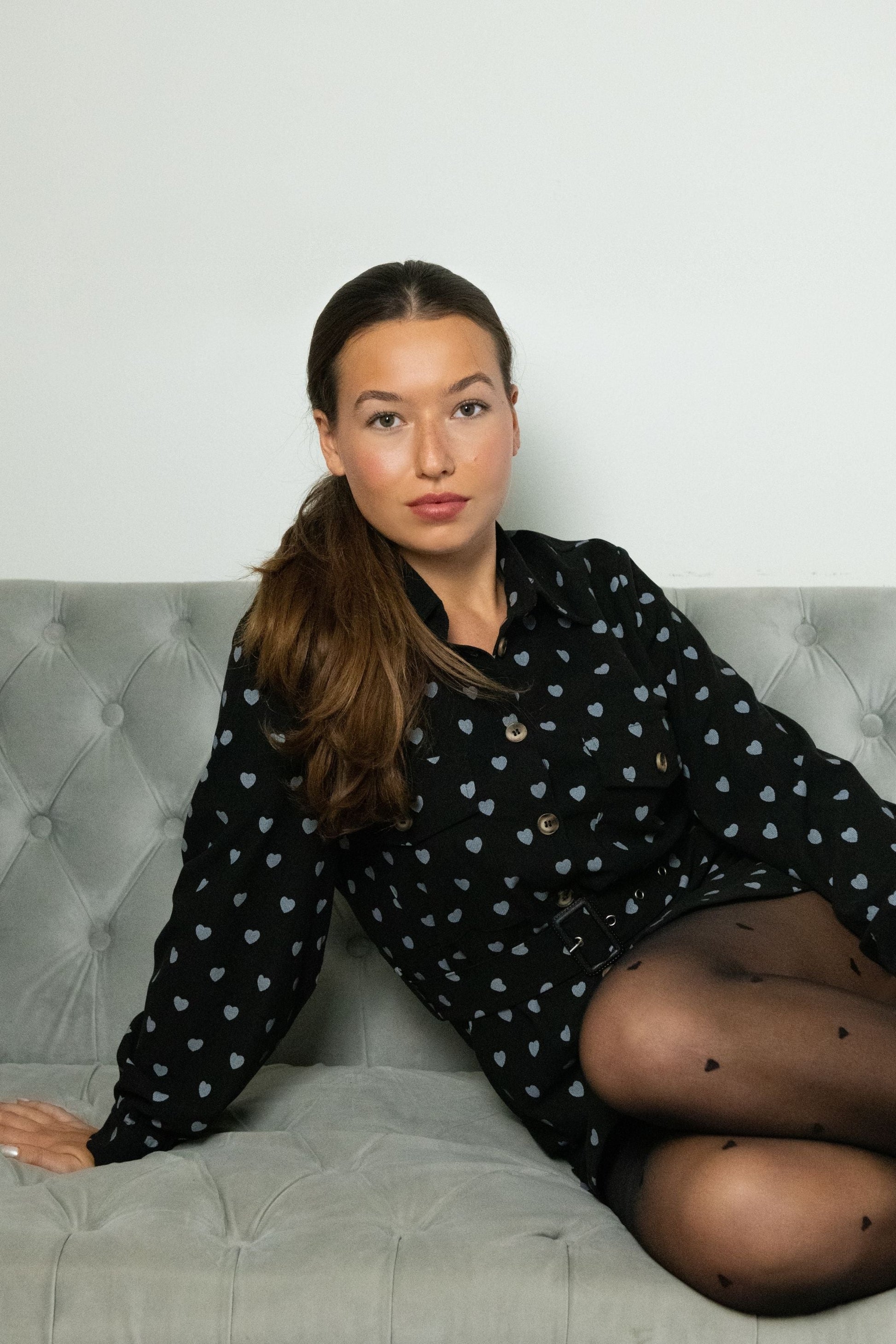 This versatile style effortlessly transitions between a mini dress or a tunic shirt top. Designed with a charming heart print motif on corduroy ground fabric, it features a classic button-front opening with turtoise buttons and chest patch pockets. The removable self-belt with a buckle enhances the waistline, creating a flattering, tailored silhouette. Long sleeves and a structured design balance playful charm with casual utility. Perfect for daytime outings or relaxed evening occasions, this piece is a stylish and functional addition to your wardrobe.