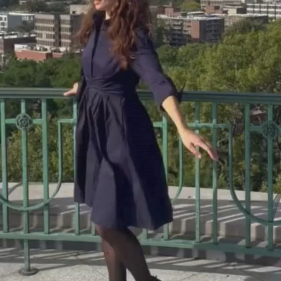 Introducing a feminine twist on the classic shirt dress. Embrace a playful elegance with this charming vintage inspired fit & flare style, it will be a delightful addition to your wardrobe. One of our best selling styles, it will be your go-to piece for comfort and flair. Has a shirt collar, 3/4 length sleeves with turned up cuffs, button front top and adjustable twist front (or back) self belted tie, that adds a touch of feminine sophistication. And guess what? We've got your convenience covered with side pockets, perfect for those little essentials.