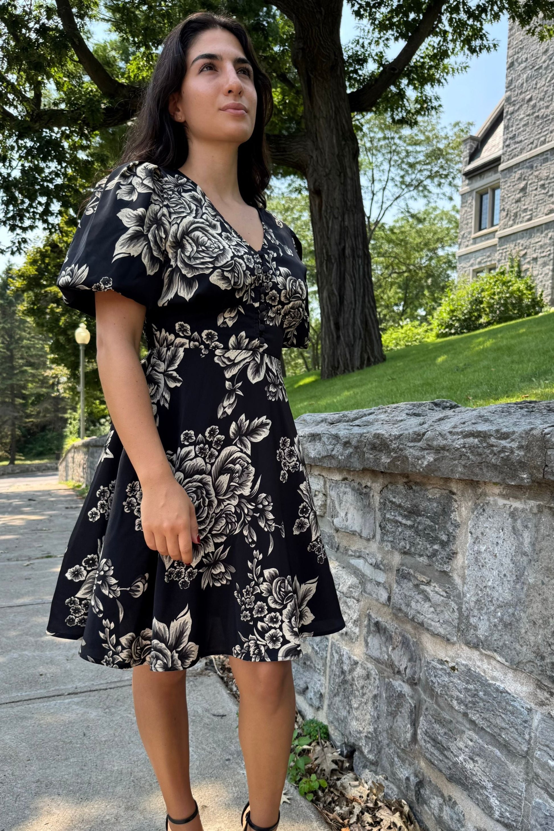 The Lottie dress brings a romantic flourish to your wardrobe with its flattering fit-and-flare silhouette and soft, flowy sleeves. Featuring an elegant floral print on a black base, this dress is designed to highlight the waist and offer easy movement with every step. Perfect for brunch dates, casual gatherings, or effortless day-to-evening looks, the Lottie dress is all about timeless charm with modern ease.