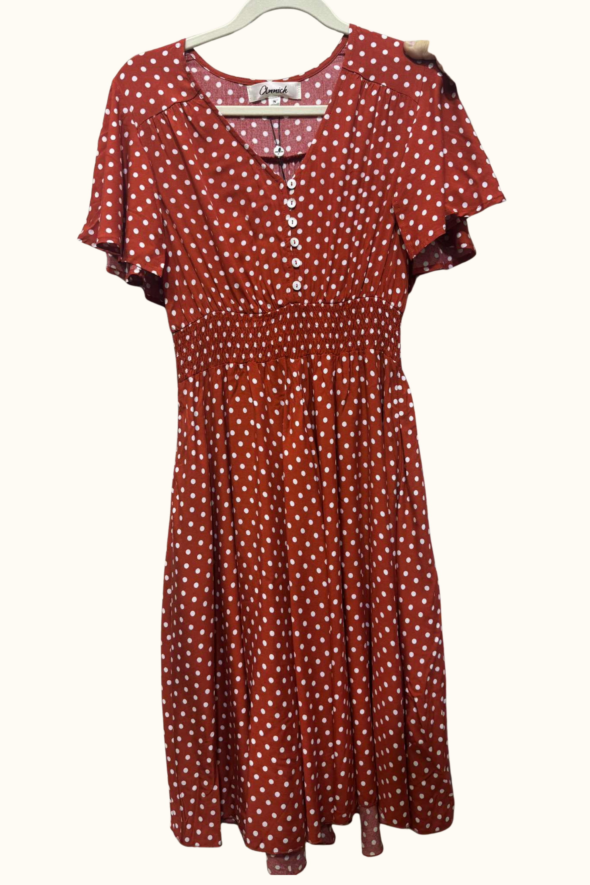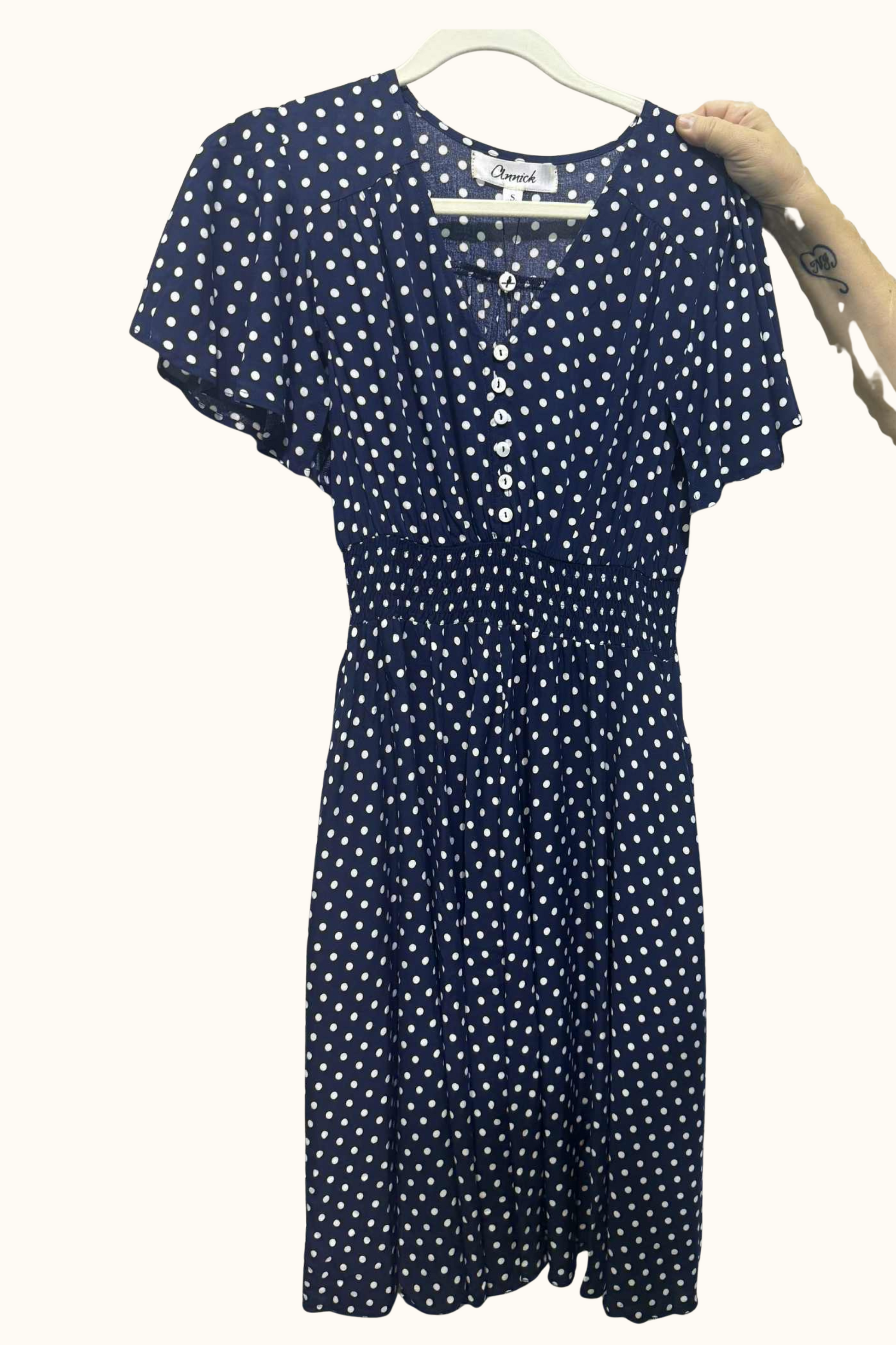 The Antoinette Dot Short Dress brings together romantic detail and everyday ease. Featuring flutter sleeves, a smocked waist, and a button-down front, this flattering silhouette flows effortlessly from day to night. Designed for movement and comfort, it's the kind of dress you'll reach for all season long. Yes, it has pockets! Ideal for warm-weather outings, brunches, or casual getaways.