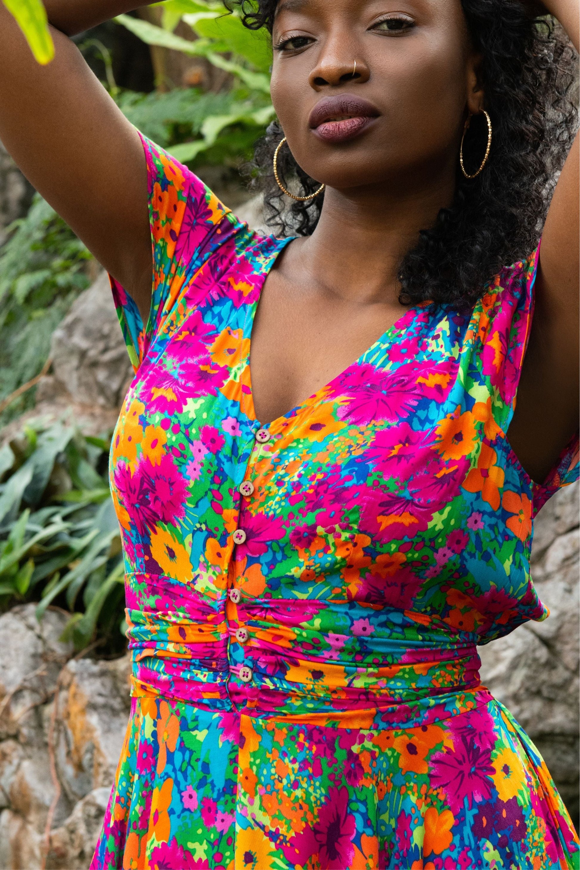 Make an entrance in the Arianna Maxi Dress — a bold, flowy statement piece with a vibrant floral print. Featuring flutter sleeves, a flattering ruched waistband, and an airy silhouette, this dress moves beautifully with every step. Made from 100% viscose, it’s breathable and soft, perfect for warm days or special occasions.