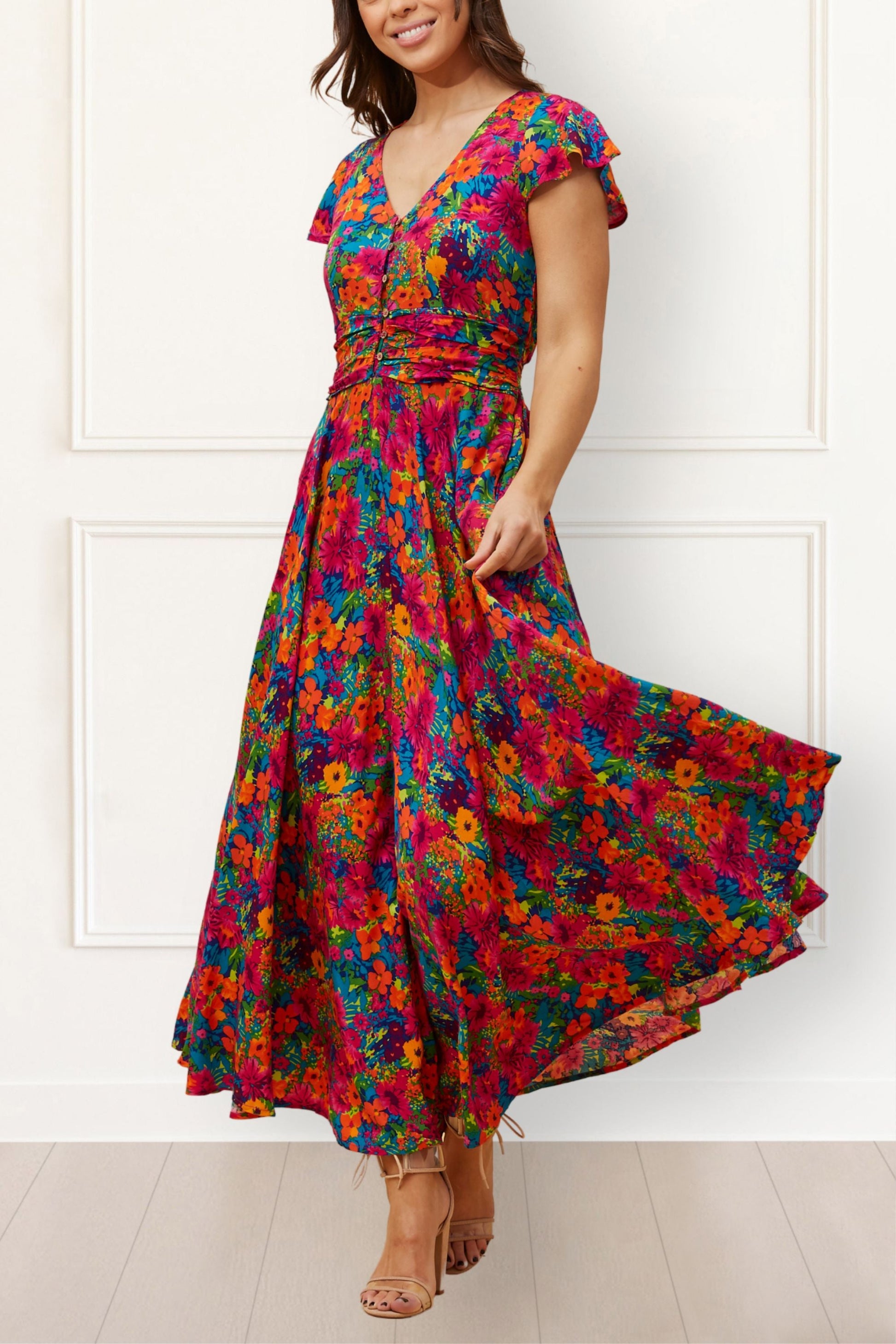 Arianna Floral Maxi Dress with Flutter Sleeves and Ruched Waist