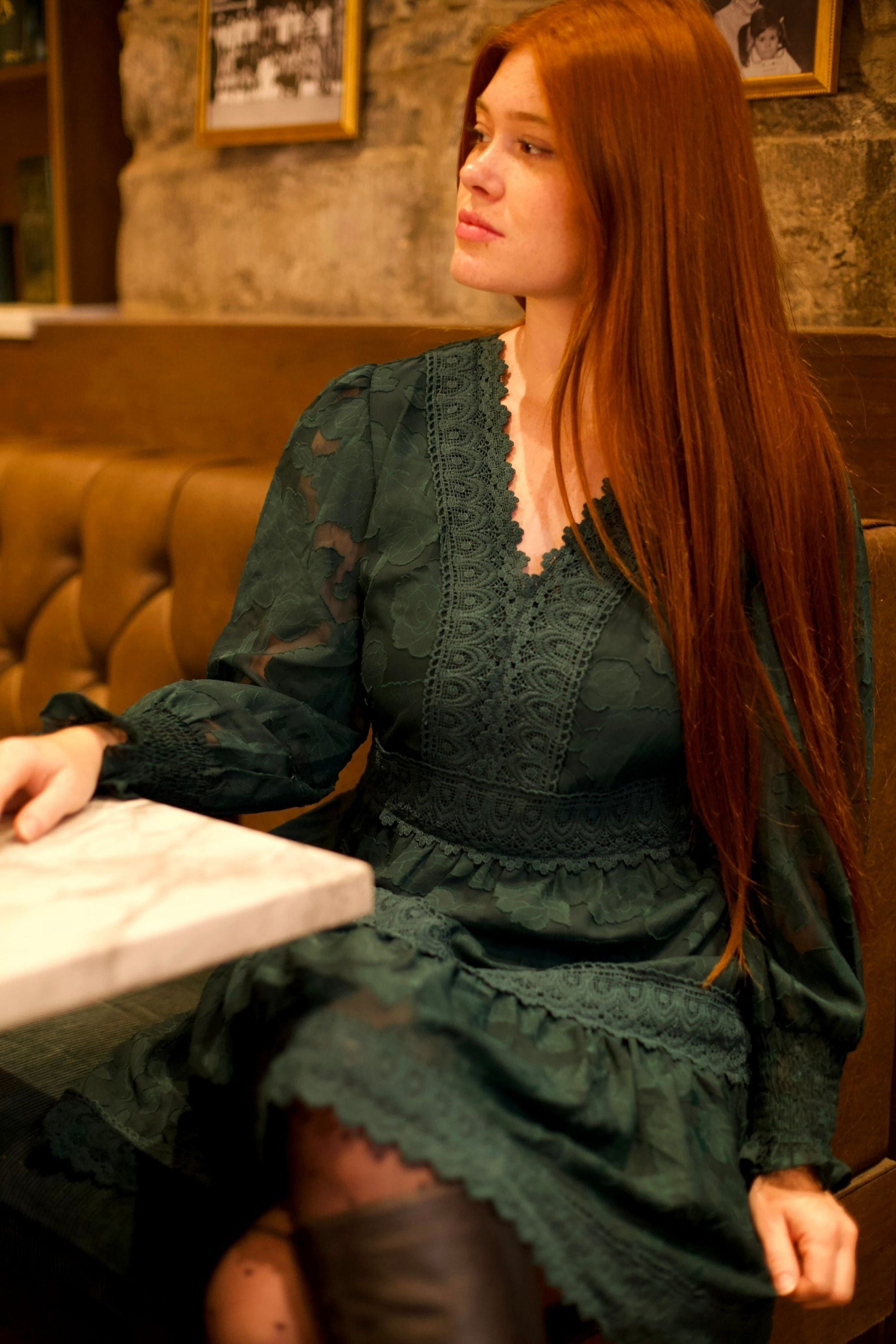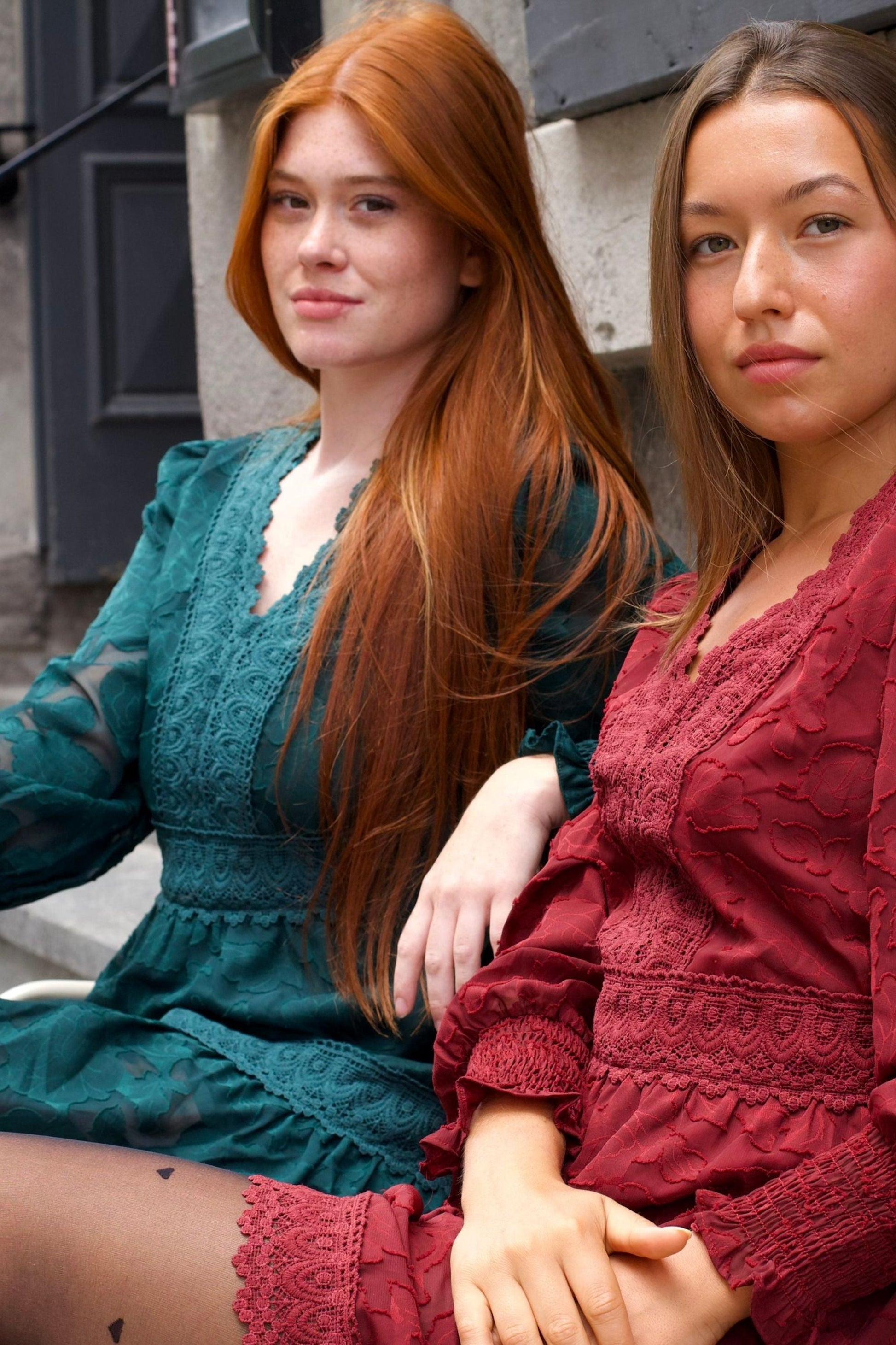 The Edith tiered short dress brings a vintage-inspired romance to modern wardrobes with its intricate lace detailing and delicate floral texture. Featuring soft tiered panels and stretch cuffs, this elegant piece comes in deep jewel tones—Green and Burgundy—that pair beautifully with both boots and heels. The soft V-neckline, sheer long sleeves, side pockets and layered skirt add graceful movement and timeless charm to any occasion.