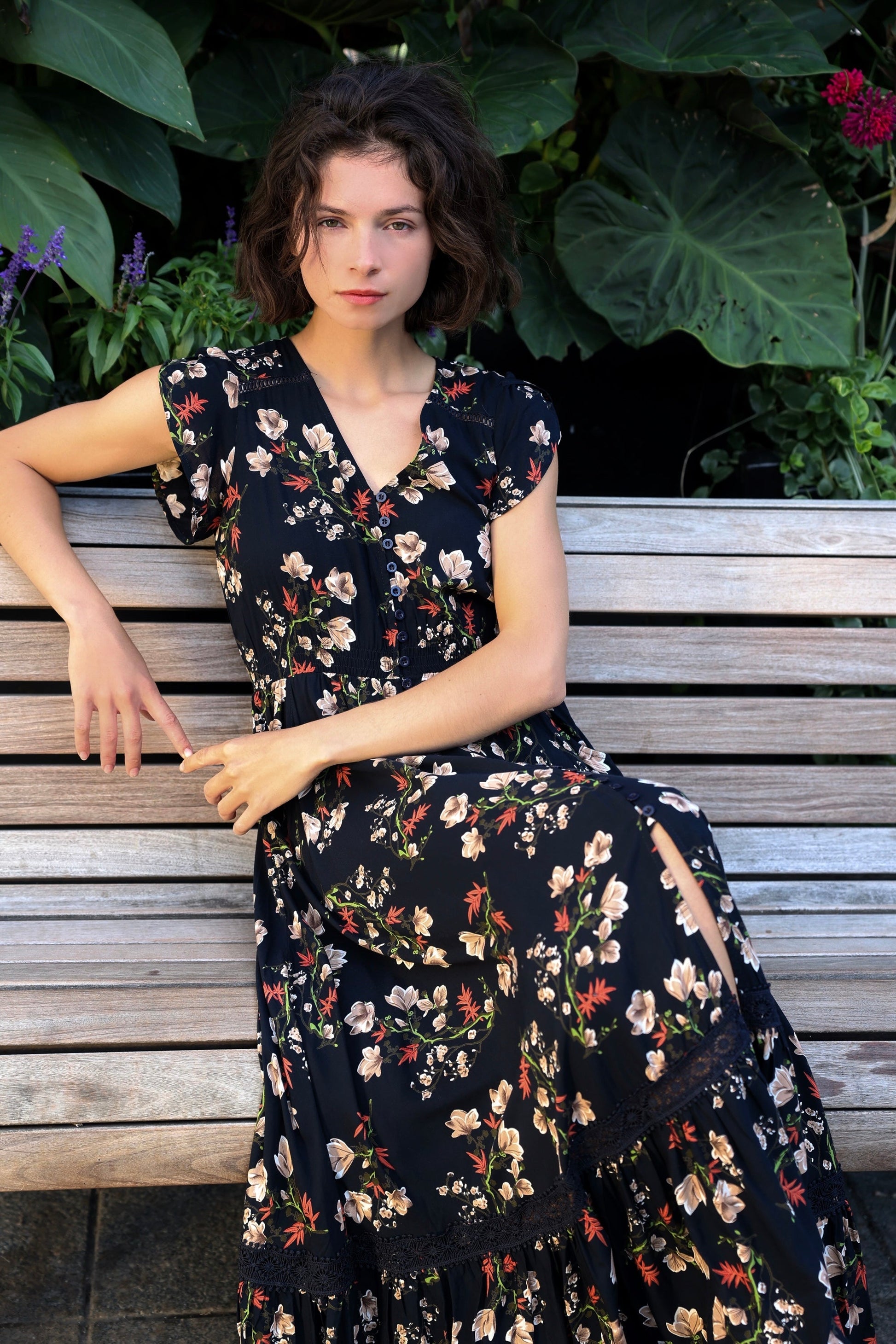 A romantic floral dress with timeless charm. Designed with a flattering V-neckline, short flutter sleeves, and a smocked waist, it creates a feminine silhouette that’s easy to wear. The button-front detail adds vintage appeal, while the tiered ruffle hem brings graceful movement. Available in elegant navy floral or deep red floral, this dress is perfect for garden parties, casual outings, or evenings out.