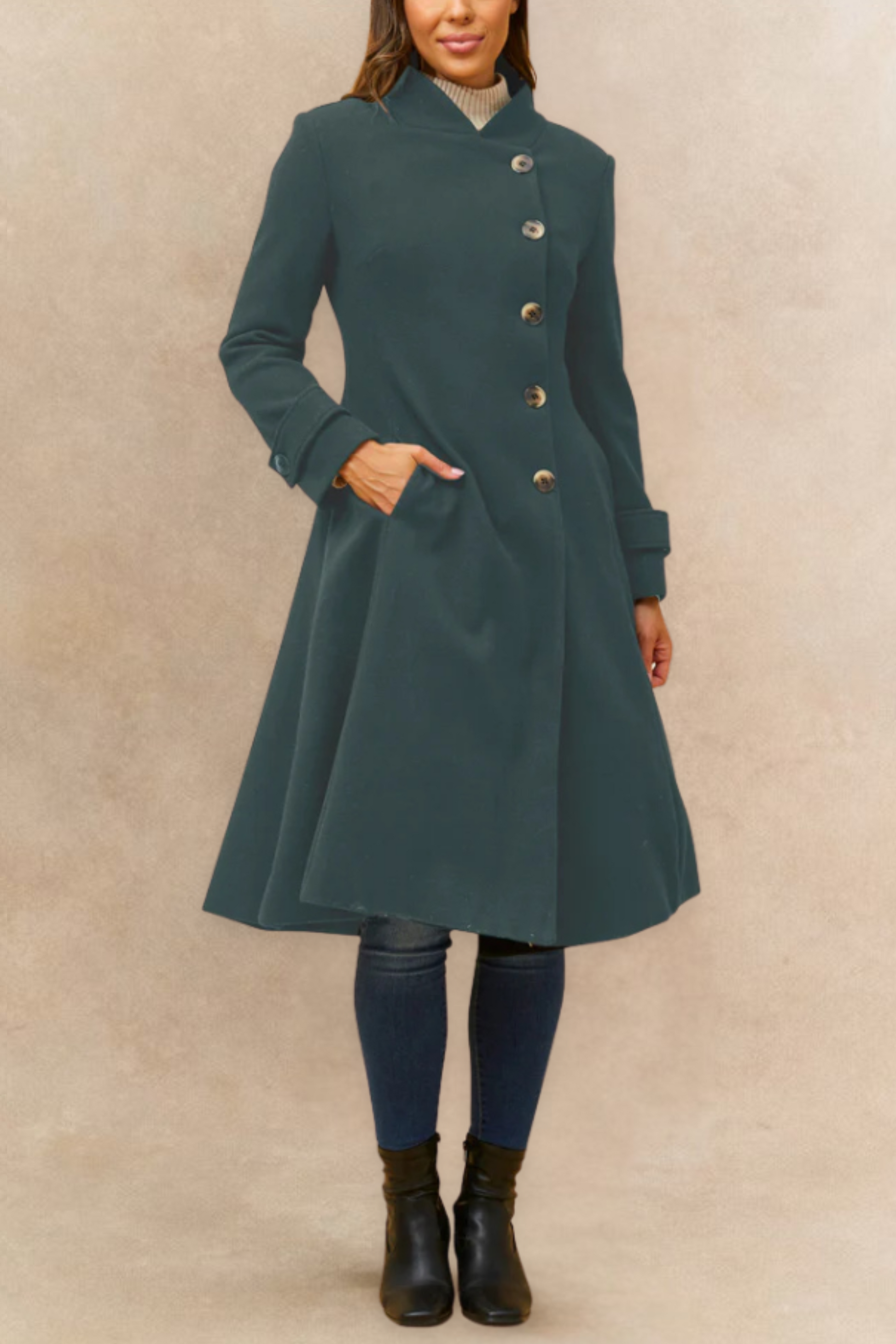 Elevate your winter wardrobe with the Harper Coat, a flawless blend of quality craftsmanship and sophisticated style. Crafted from premium fabric, this coat offers both comfort and a distinctive wow factor, highlighted by its unique side button closure. Its tailored fit and flared design beautifully accentuate your curves, creating a comfortably flattering silhouette for all body types. Finished with an officer collar, the Harper Coat is a versatile piece that pairs effortlessly with elegant dresses or casual jeans, making it a best seller.