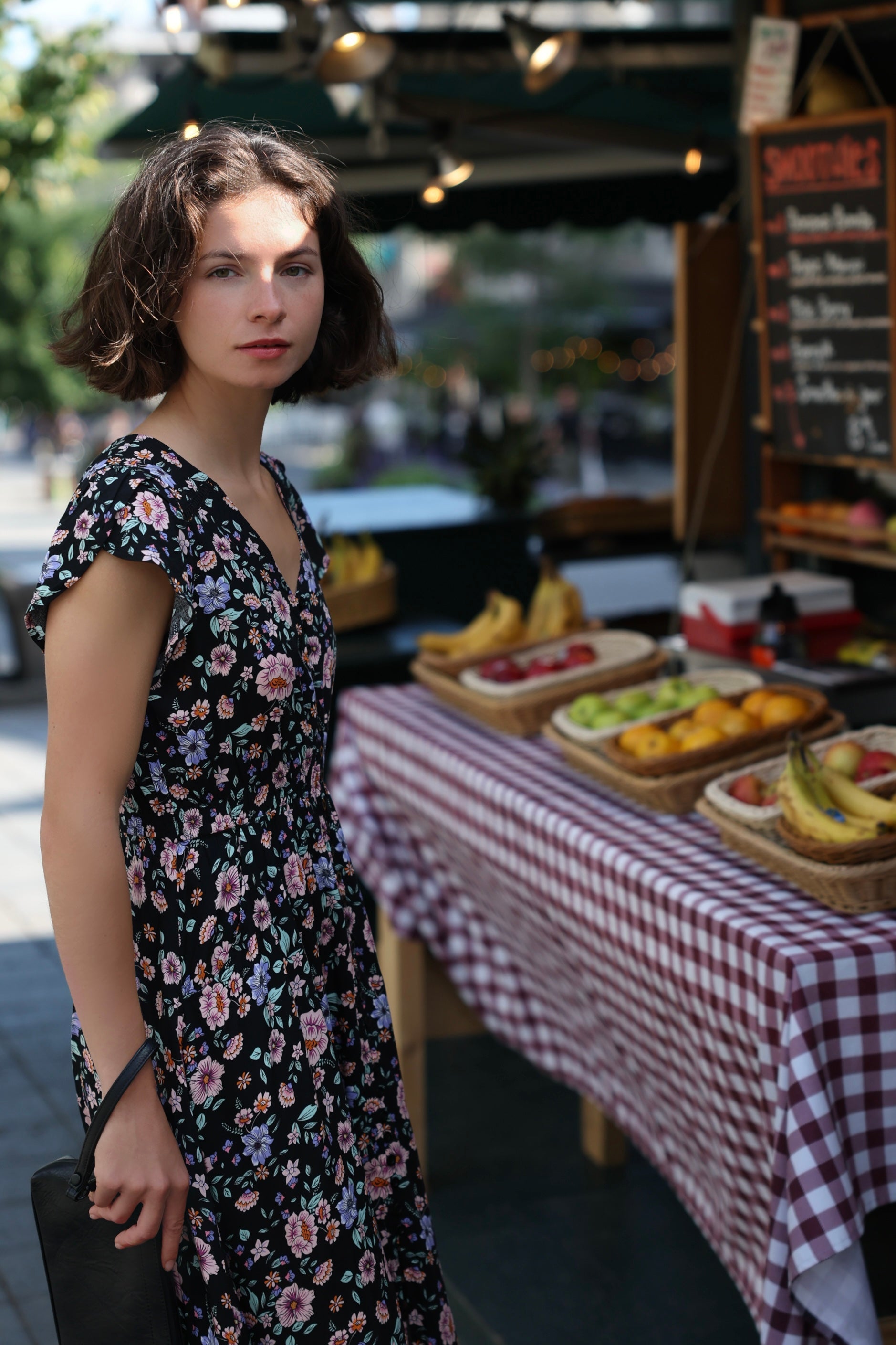 A romantic black maxi dress blooming with vibrant florals in soft pinks, lilacs, and tangerines. The flattering V-neckline, cap sleeves, and smocked waist offer an effortless, feminine silhouette. A flowy tiered hem with boho border detail adds charm and movement. Pair it with sandals or sneakers for daytime ease or heels for nights. Perfect for garden parties, weekend strolls, or casual office days.