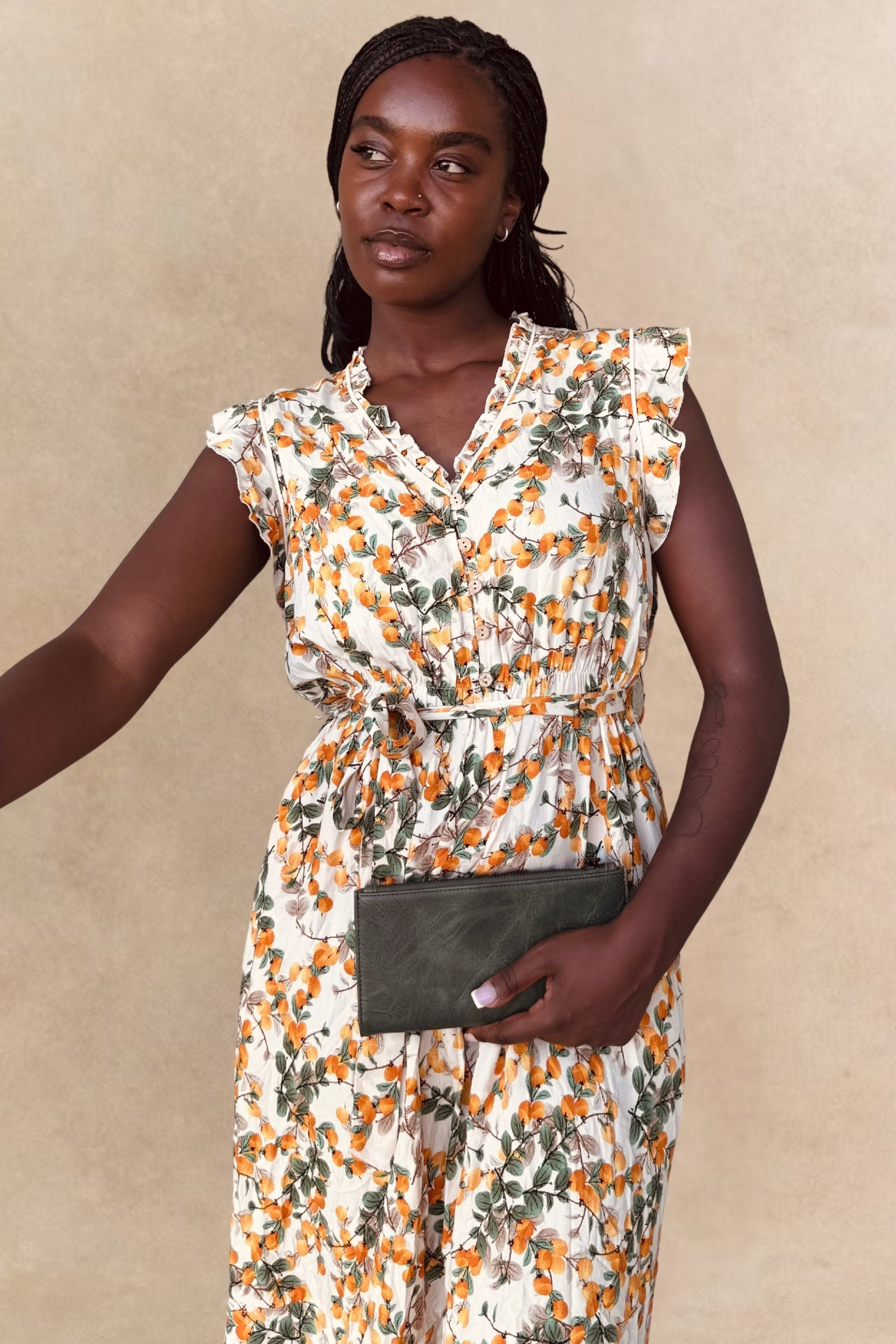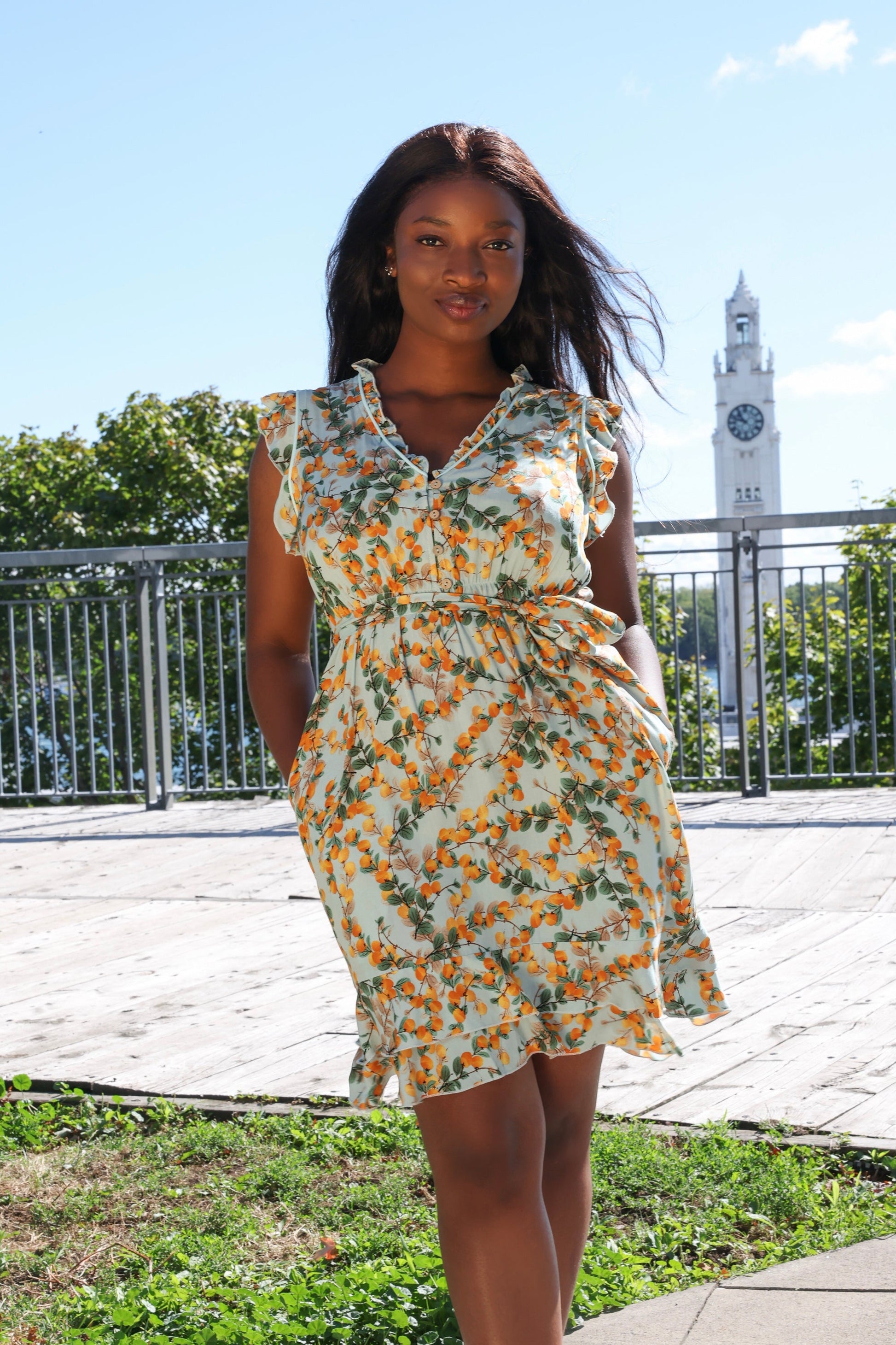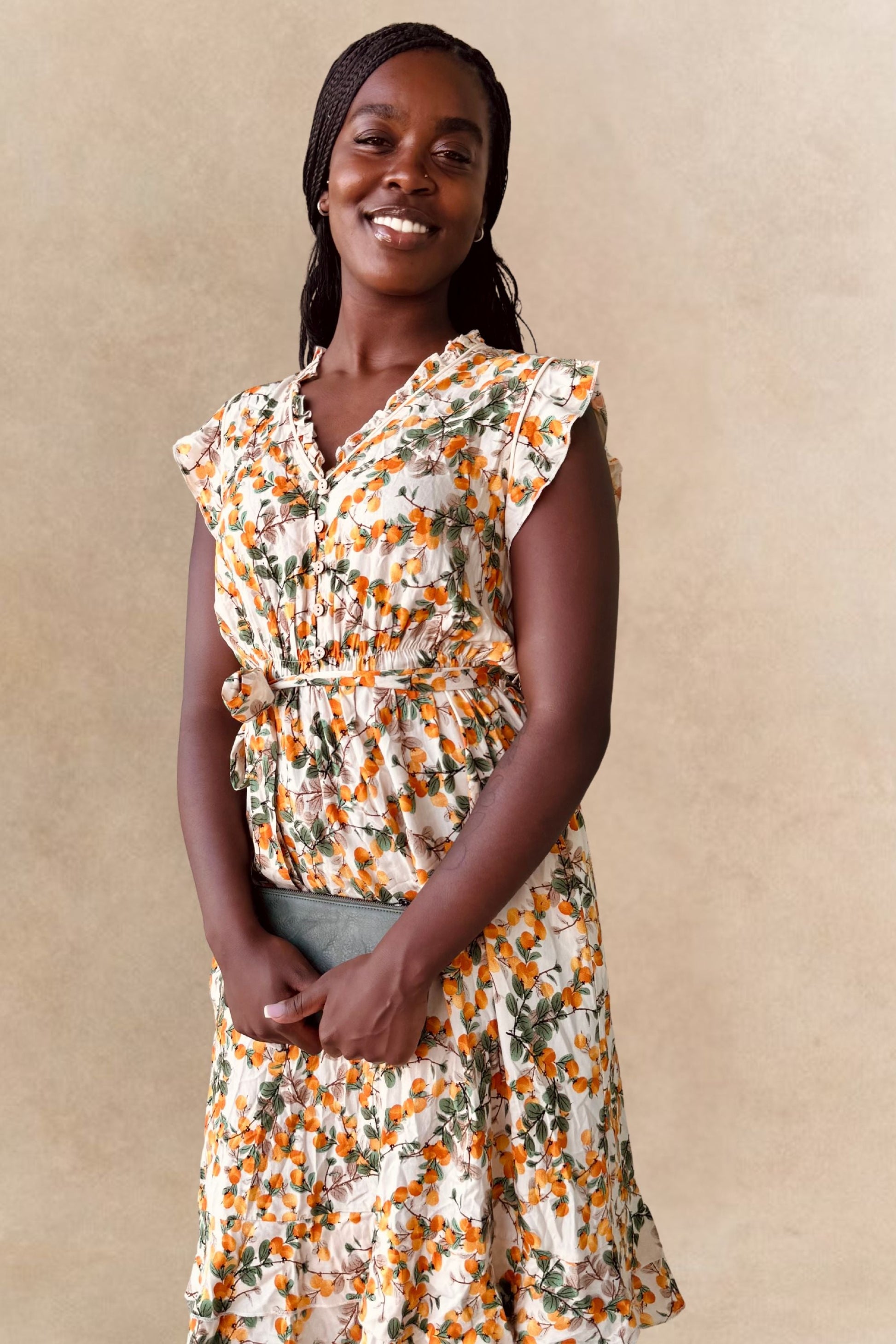 Sweet and effortlessly feminine, the Natasha Citrus print dress brings a playful update to this best-selling silhouette. With flutter sleeves, a ruffle-trimmed neckline, and a removable self-tie belt at the elastic waist, it flatters every figure while keeping things light and breezy. Side pockets add function to its flirty charm. Made from breathable light weight fabric for a breathable, flowy feel.