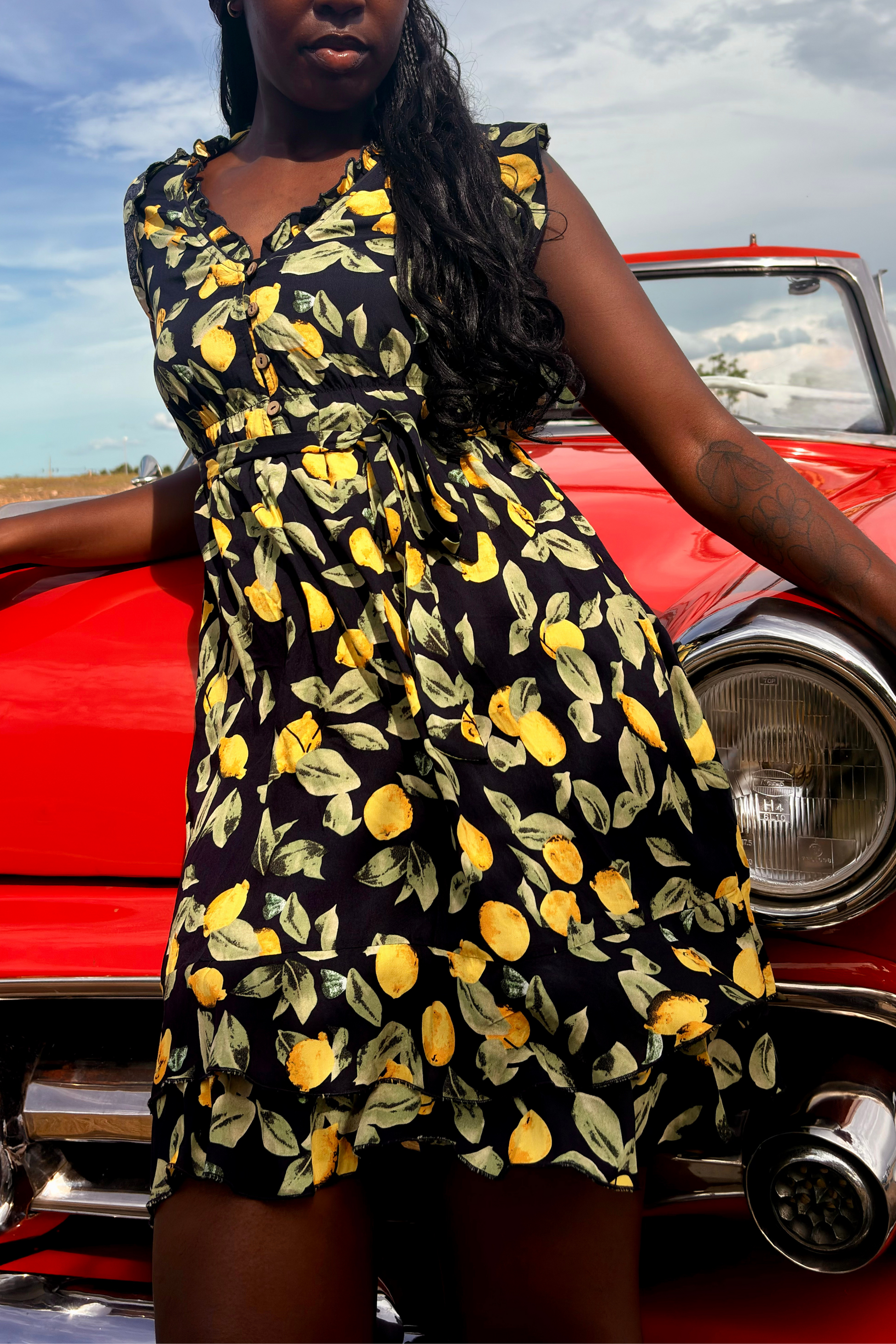 Natasha Lemon Print Short Dress Belt Pockets Ruffled Hem