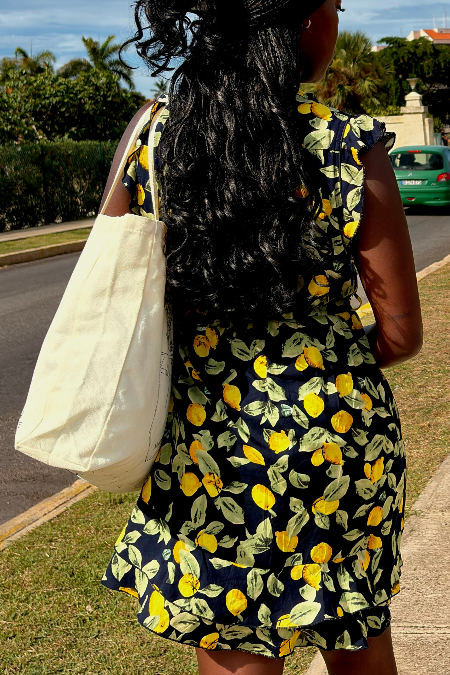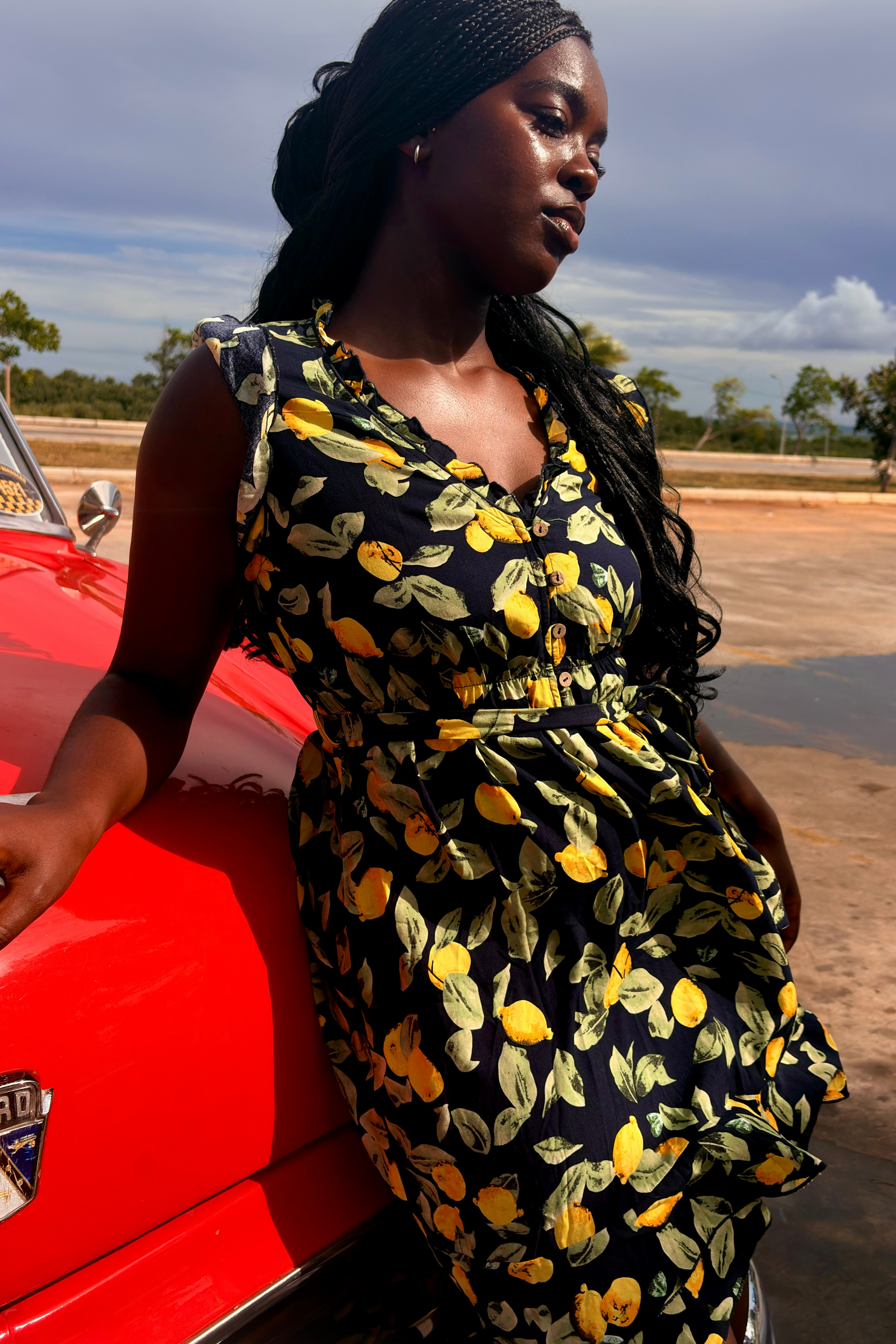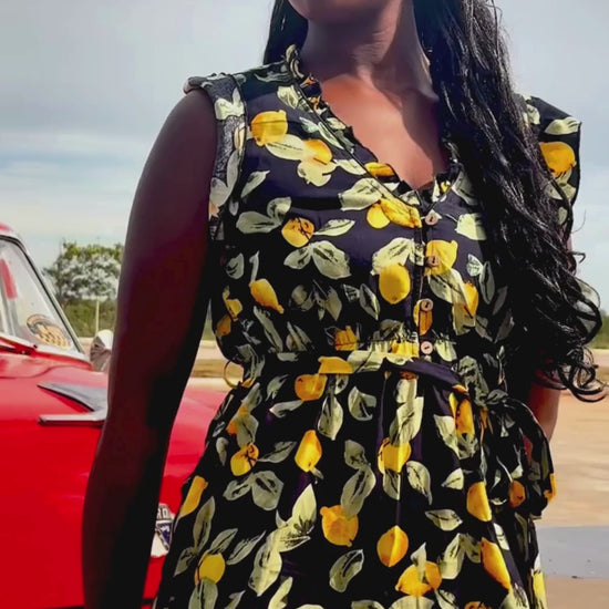 The Natasha Short dress in lemon print brings a fresh, playful twist to a flattering everyday silhouette. With flutter sleeves, a ruffle-trimmed neckline, and a removable belt at the elastic waist, it’s designed to move with you and brighten your wardrobe. Side seam pockets add a touch of function to this vibrant favorite. Crafted in a lightweight breathable fabric for a soft comfortable fit.