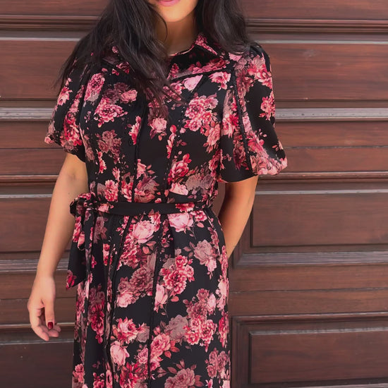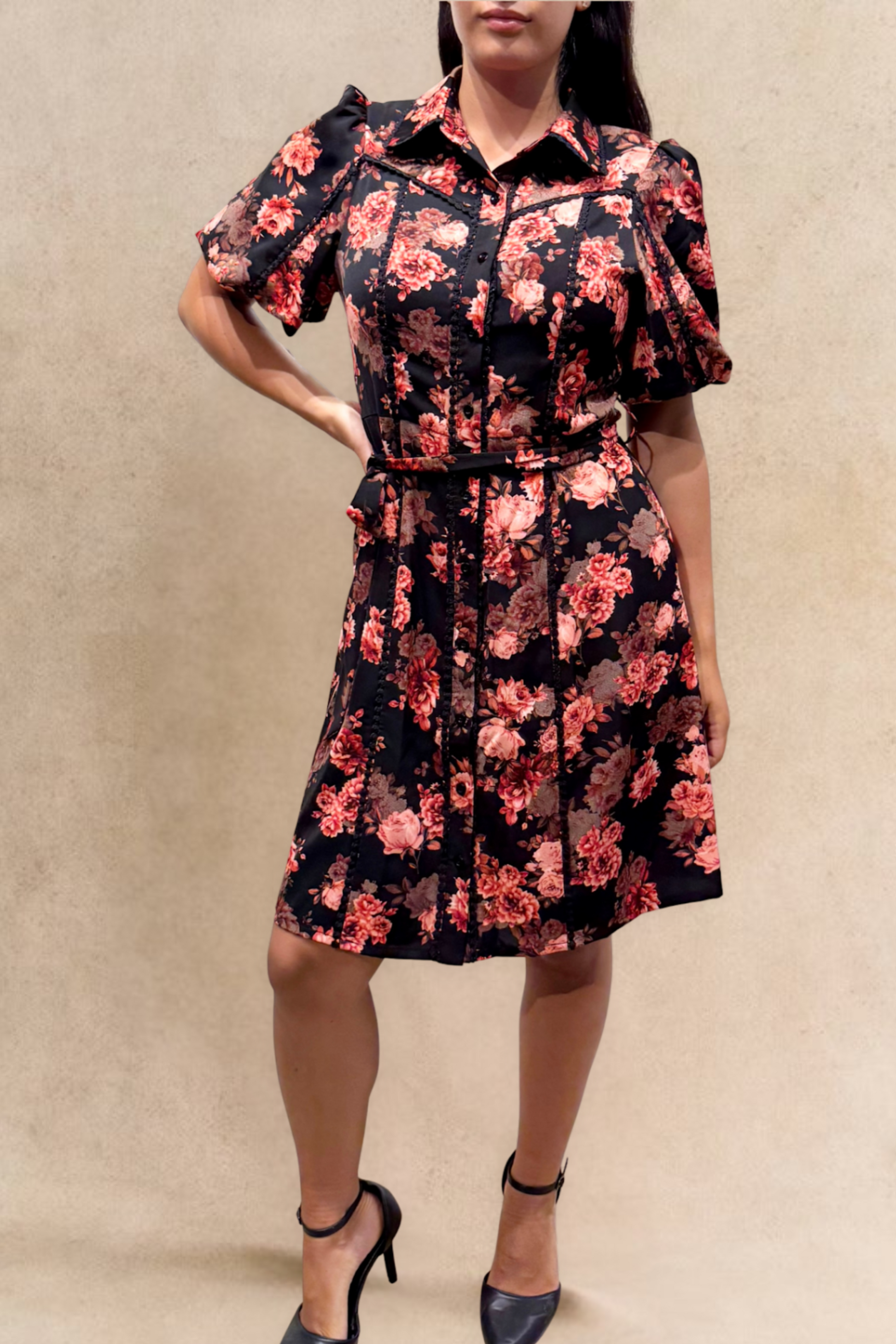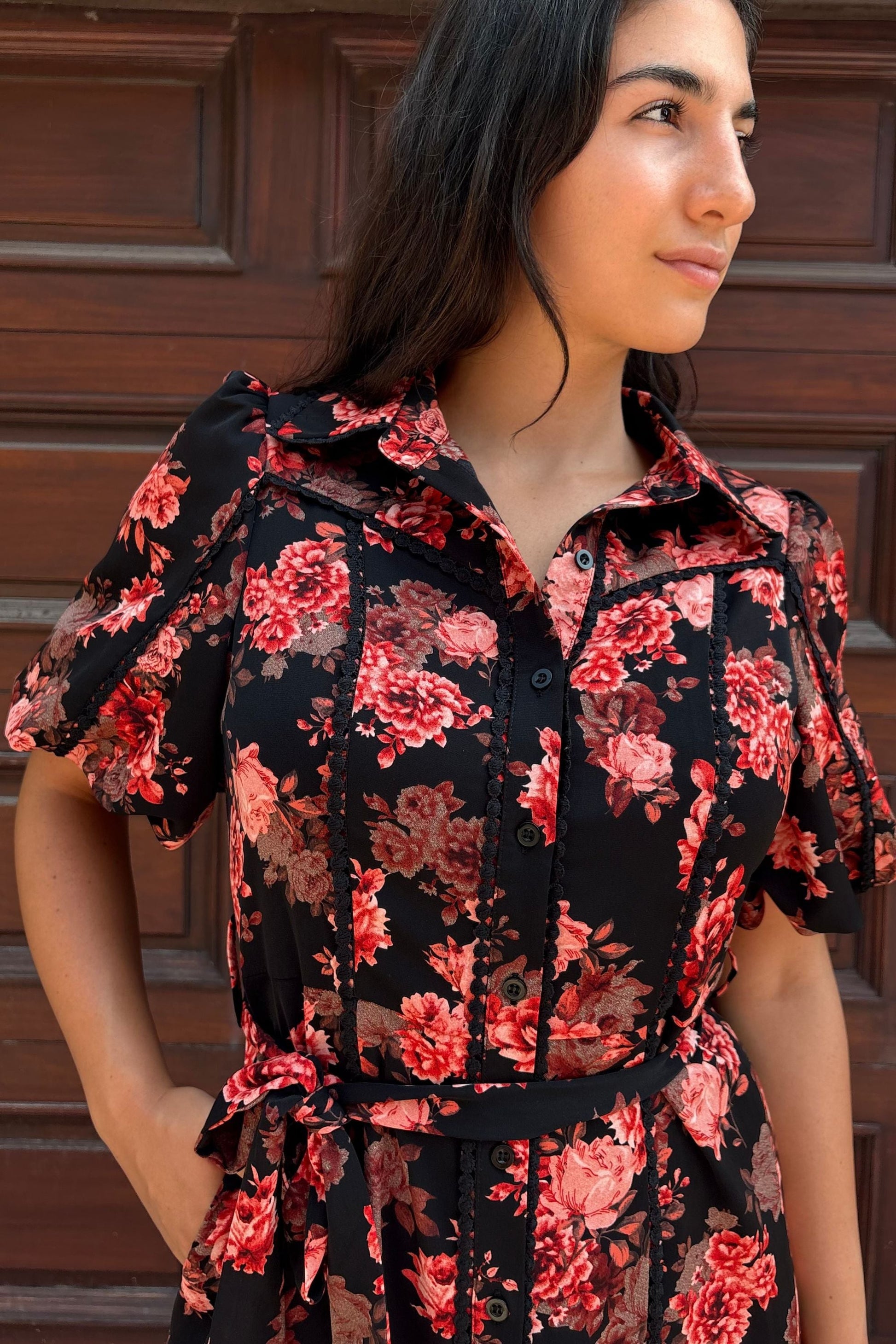 The Ruby dress blends vintage-inspired charm with modern tailoring in a standout floral shirt-dress silhouette. Crafted in a rich black fabric adorned with bold red floral prints and delicate embroidery details, this piece features a classic collar, front buttons, and a matching belt to define the waist. With a flattering knee length, Ruby is a perfect option for polished daytime looks or dressed-up evenings.
