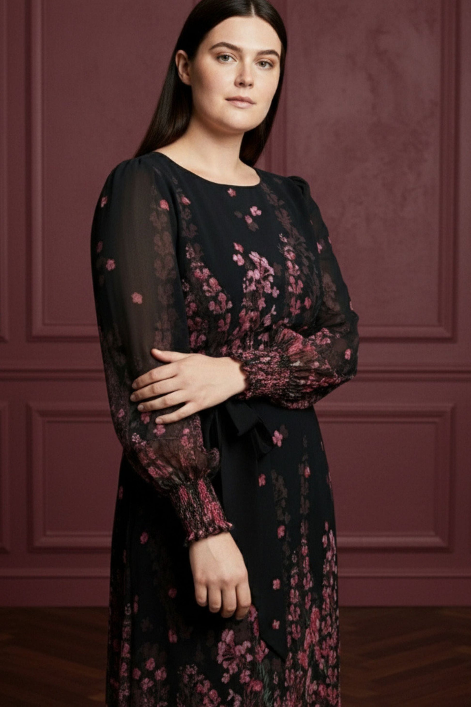 A timeless black dress brought to life with cascading pink floral prints. Featuring long sheer sleeves, a soft round neckline, and a flattering self-tie belt, the Seraphina dress pairs elegance with ease. Its lightweight, flowy fabric and feminine silhouette make it ideal for both special occasions and everyday sophistication.